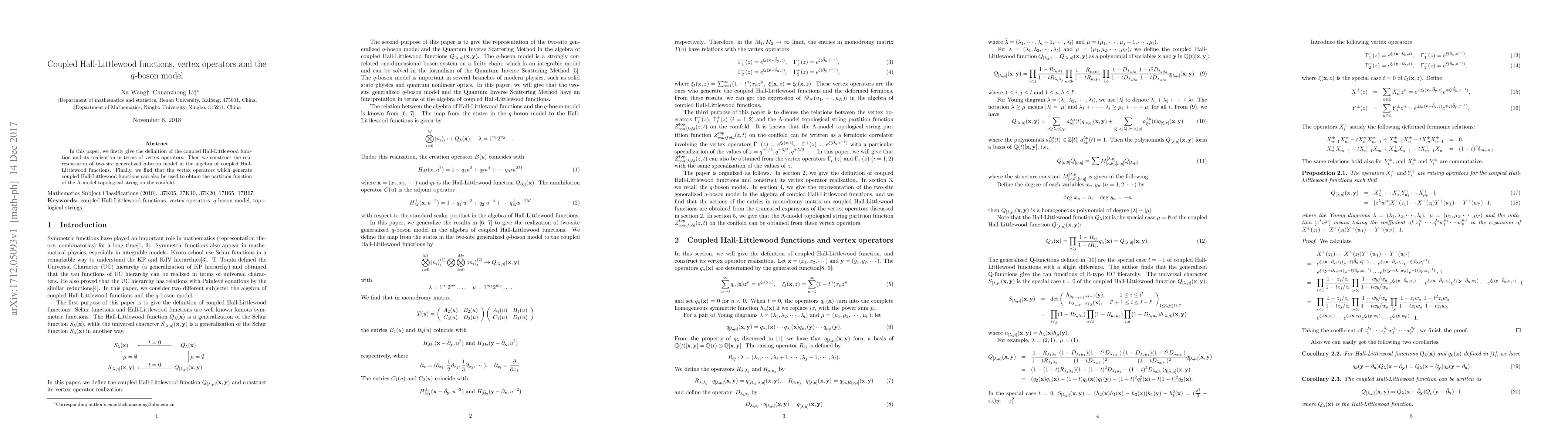 This paper defines coupled Hall-Littlewood functions and realizes them via vertex operators, constructs a two-site generalized $q$-boson model representation using these functions, and demonstrates their utility in computing the partition function of the A-model topological string on the conifold.