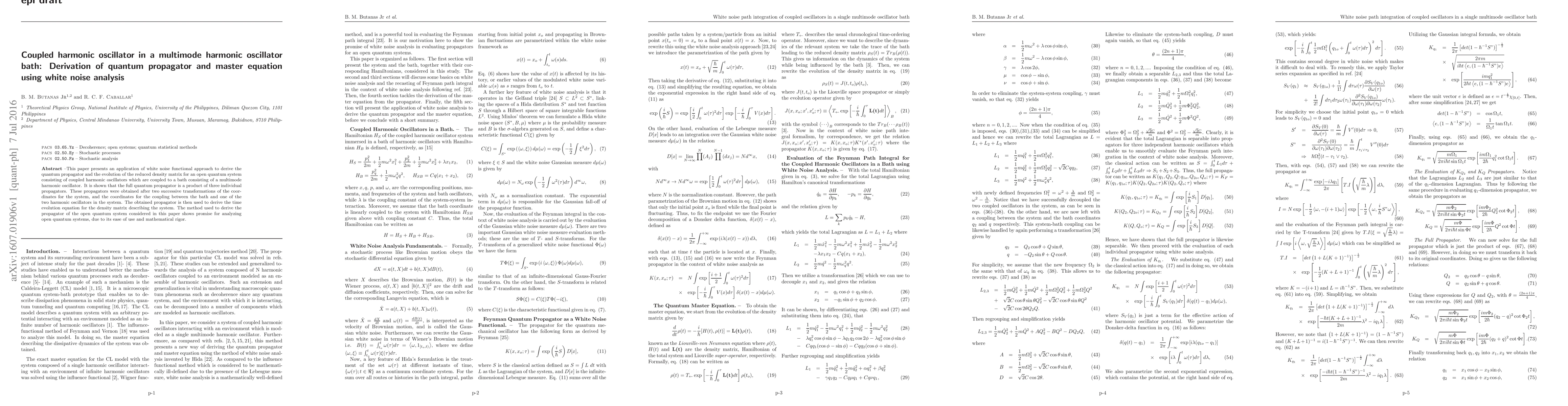 This paper uses white noise functional analysis to derive the quantum propagator and the master equation for a coupled harmonic oscillator system interacting with a multimode harmonic oscillator bath. The full quantum propagator is decomposed into three individual propagators through coordinate transformations, facilitating the derivation of the density matrix evolution equation.