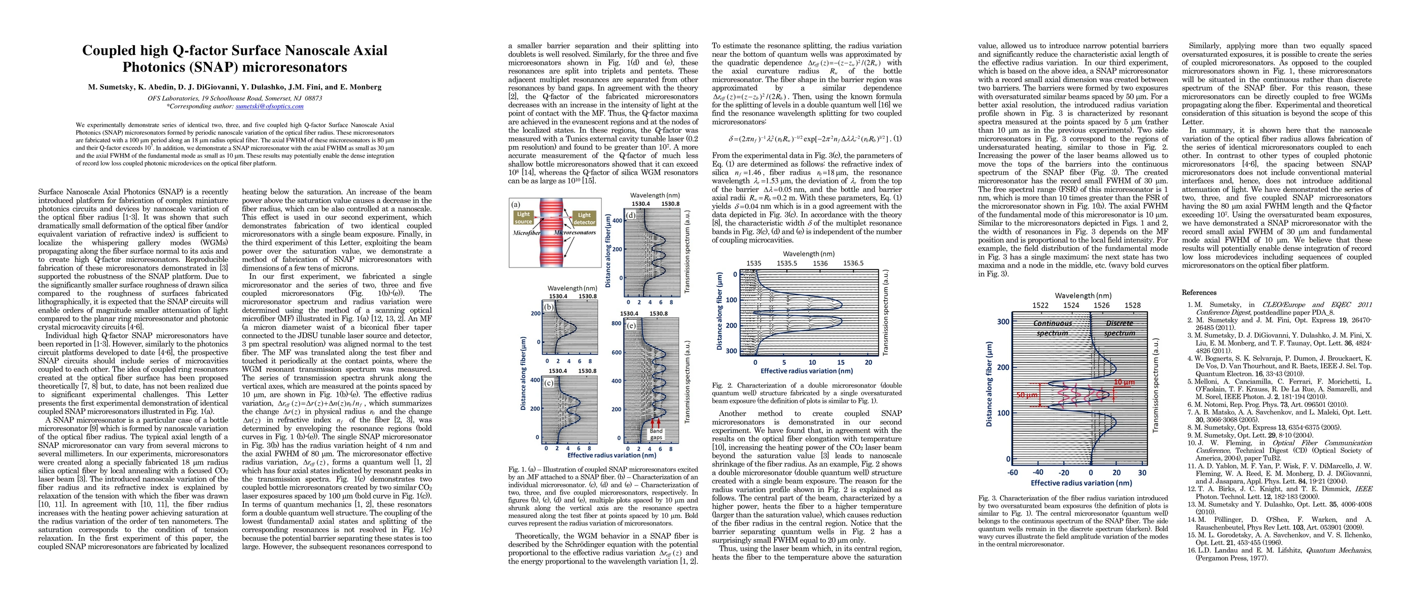 This research demonstrates the fabrication of high Q-factor Surface Nanoscale Axial Photonics (SNAP) microresonators via periodic nanoscale variation in optical fiber radius, achieving coupled series of two, three, and five resonators with Q-factors exceeding 107. The study also reports a microresonator with an axial FWHM as small as 30 µm, potentially enabling dense integration of low-loss photonic devices.