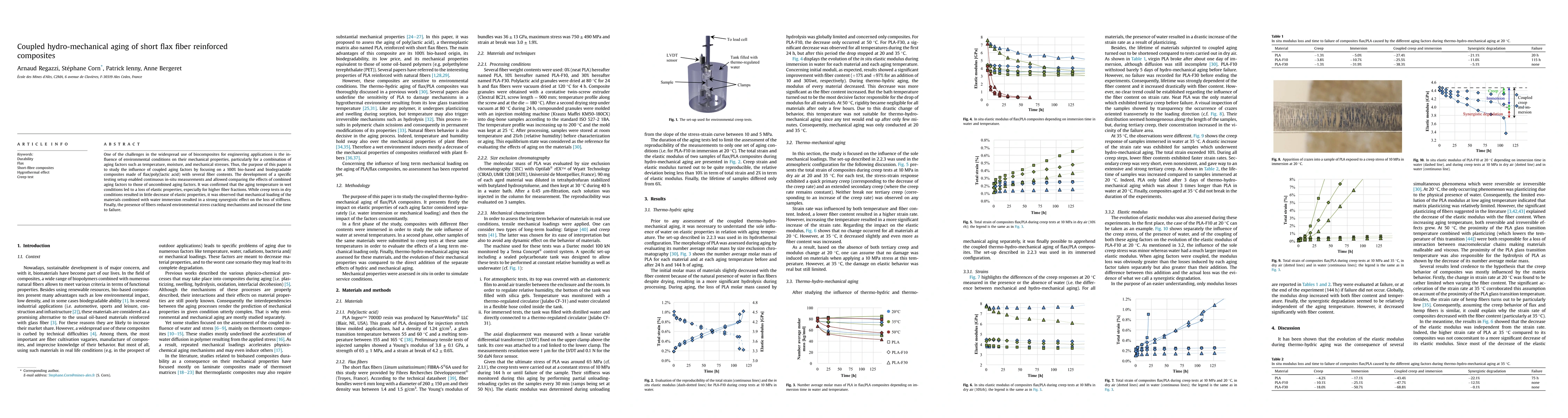 This paper investigates the hydro-mechanical aging effects on short flax fiber reinforced poly(lactic acid) composites, revealing that combined aging factors like temperature, moisture, and mechanical stress synergistically degrade stiffness, especially with higher fiber contents. Fibers mitigate environmental stress cracking and extend failure time.