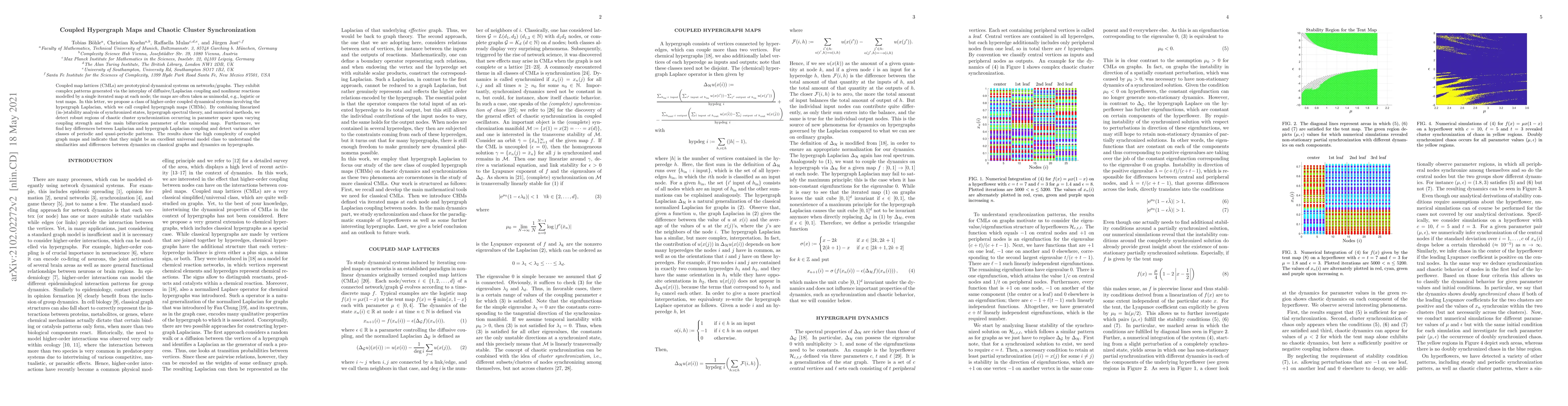 Coupled map lattices (CMLs) are prototypical dynamical systems on networks/graphs. They exhibit complex patterns generated via the interplay of diffusive/Laplacian coupling and nonlinear reactions modelled by a single iterated map at each node; the maps are often taken as unimodal, e.g., logistic or tent maps. In this letter, we propose a class of higher-order coupled dynamical systems involving the hypergraph Laplacian, which we call coupled hypergraph maps (CHMs). By combining linearized (in-)stability analysis of synchronized states, hypergraph spectral theory, and numerical methods, we detect robust regions of chaotic cluster synchronization occurring in parameter space upon varying coupling strength and the main bifurcation parameter of the unimodal map. Furthermore, we find key differences between Laplacian and hypergraph Laplacian coupling and detect various other classes of periodic and quasi-periodic patterns. The results show the high complexity of coupled graph maps and indicate that they might be an excellent universal model class to understand the similarities and differences between dynamics on classical graphs and dynamics on hypergraphs.