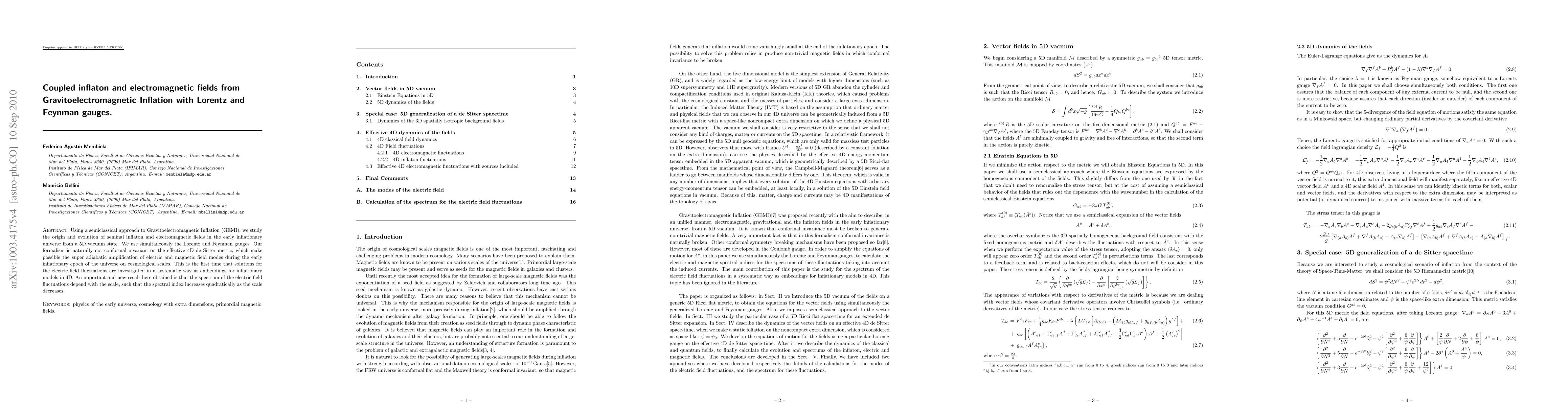 Using a semiclassical approach to Gravitoelectromagnetic Inflation (GEMI), we study the origin and evolution of seminal inflaton and electromagnetic fields in the early inflationary universe from a 5D vacuum state. We use simultaneously the Lorentz and Feynman gauges. Our formalism is naturally not conformal invariant on the effective 4D de Sitter metric, which make possible the super adiabatic amplification of electric and magnetic field modes during the early inflationary epoch of the universe on cosmological scales. This is the first time that solutions for the electric field fluctuations are investigated in a systematic way as embeddings for inflationary models in 4D. An important and new result here obtained is that the spectrum of the electric field fluctuations depend with the scale, such that the spectral index increases quadratically as the scale decreases.