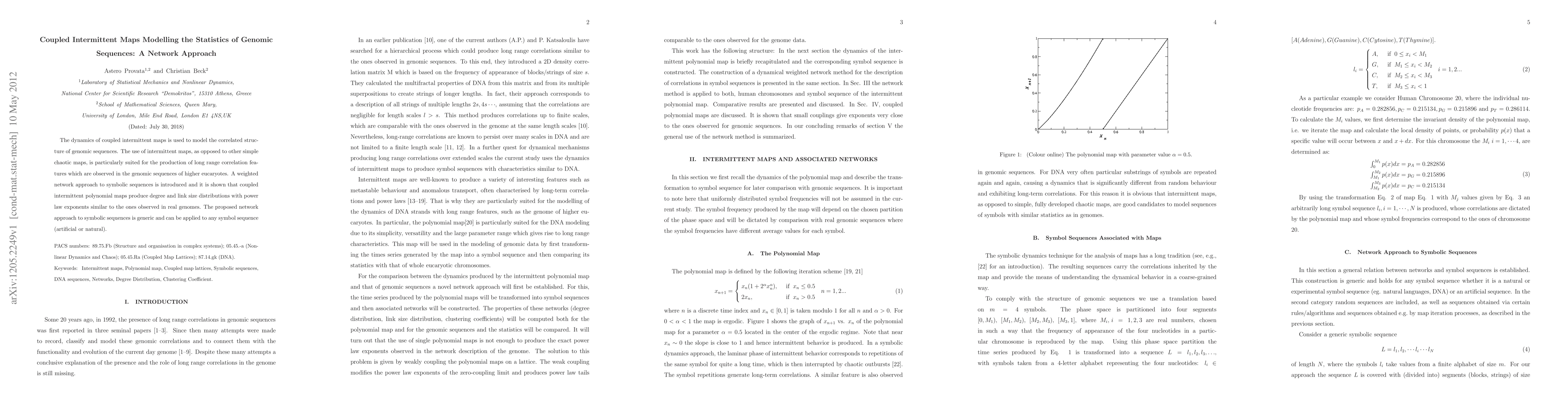 This paper models the correlated structure of genomic sequences using coupled intermittent maps, which generate long-range correlations observed in higher eukaryotes. It introduces a weighted network approach to symbolic sequences, demonstrating that coupled intermittent polynomial maps produce power law distributions similar to those found in real genomes.