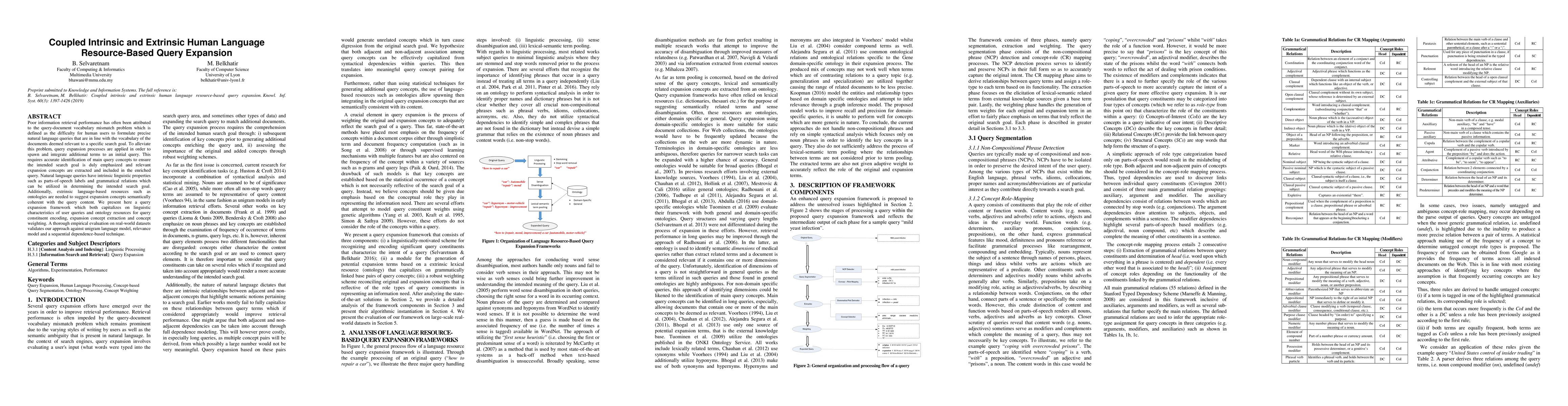 This paper proposes a query expansion framework that leverages both intrinsic linguistic properties of user queries and extrinsic language resources like ontologies to enhance search relevance. The method is validated through empirical evaluation against several baseline models.