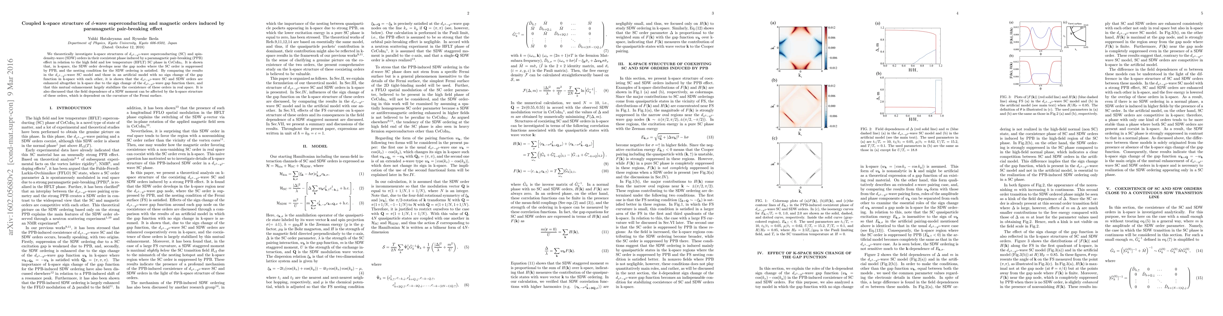 We theoretically investigate k-space structures of $d_{x^2-y^2}$-wave superconducting (SC) and spin-density-wave (SDW) orders in their coexistent phase induced by a paramagnetic pair-breaking (PPB) effect in relation to the high field and low temperature (HFLT) SC phase in CeCoIn$_5$. It is shown that, in k-space, the SDW order develops near the gap nodes where the SC order is suppressed by PPB, and the nesting condition for the SDW ordering is satisfied. By comparing the results in the $d_{x^2-y^2}$-wave SC model and those in an artificial model with no sign change of the gap function in k-space with each other, it is shown that the $d_{x^2-y^2}$-wave SC and SDW orders are enhanced altogether in k-space due to the sign change of the $d_{x^2-y^2}$-wave gap function there, and that this mutual enhancement largely stabilizes the coexistence of these orders in real space. It is also discussed that the field dependence of a SDW moment can be affected by the k-space structure of these orders, which is dependent on the curvature of the Fermi surface.