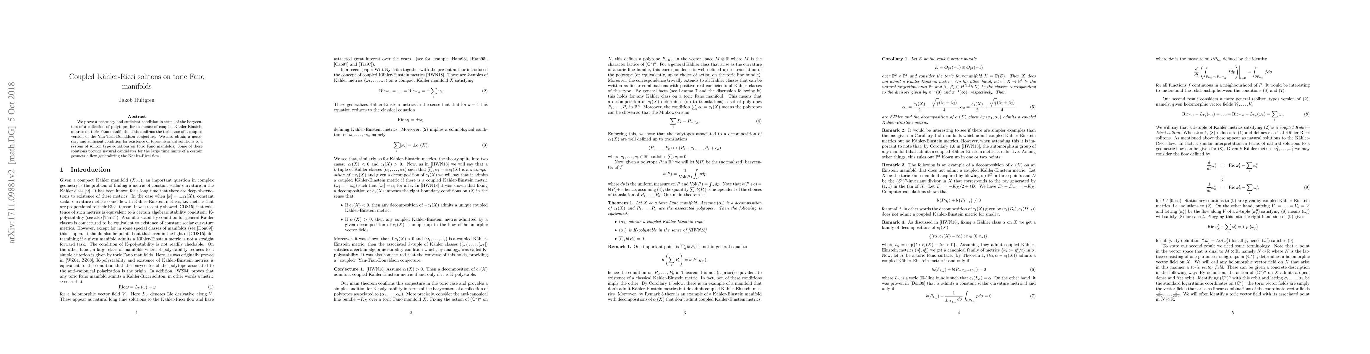 The paper introduces and proves a novel necessary and sufficient condition for coupled Kähler-Einstein metrics, linking toric geometry with soliton theory in a significant way.