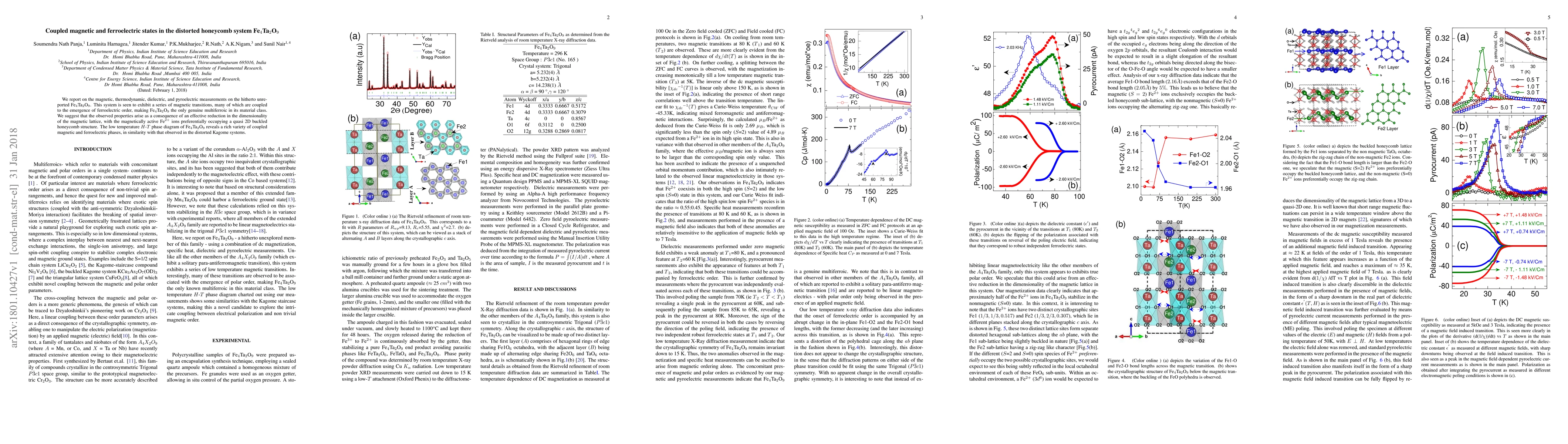 We report on the magnetic, thermodynamic, dielectric, and pyroelectric measurements on the hitherto unreported Fe${_4}$Ta${_2}$O${_9}$. This system is seen to exhibit a series of magnetic transitions, many of which are coupled to the emergence of ferroelectric order, making Fe${_4}$Ta${_2}$O${_9}$ the only genuine multiferroic in its material class. We suggest that the observed properties arise as a consequence of an effective reduction in the dimensionality of the magnetic lattice, with the magnetically active Fe${^{2+}}$ ions preferentially occupying a quasi 2D buckled honeycomb structure. The low temperature $H$-$T$ phase diagram of Fe${_4}$Ta${_2}$O${_9}$ reveals a rich variety of coupled magnetic and ferroelectric phases, in similarity with that observed in the distorted Kagome systems.