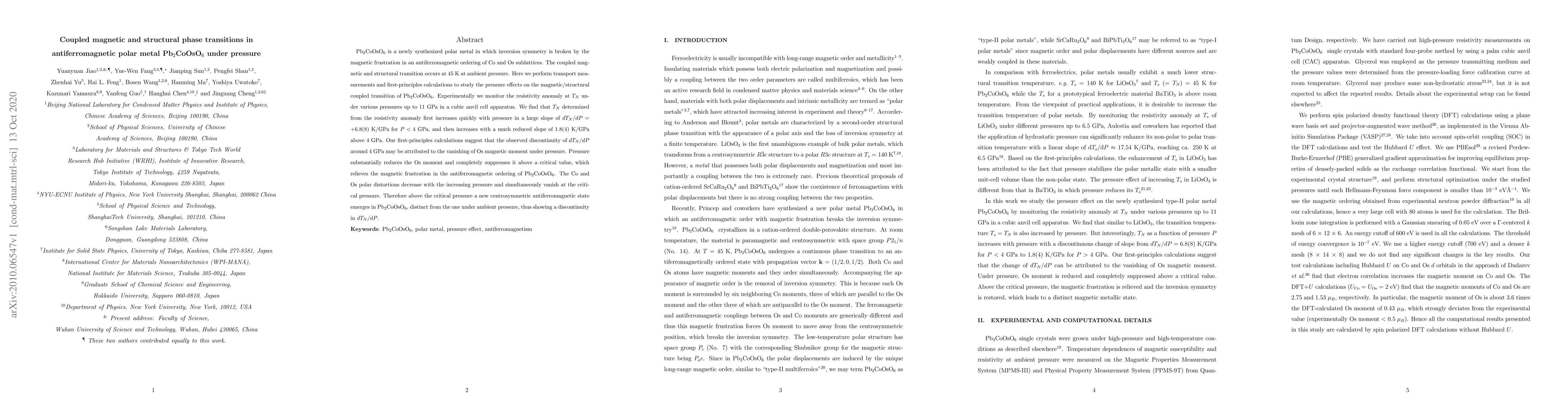 The study utilizes transport measurements, first-principles calculations, and a cubic anvil cell apparatus to investigate the pressure effects on the coupled magnetic and structural transition in Pb2CoOsO6.