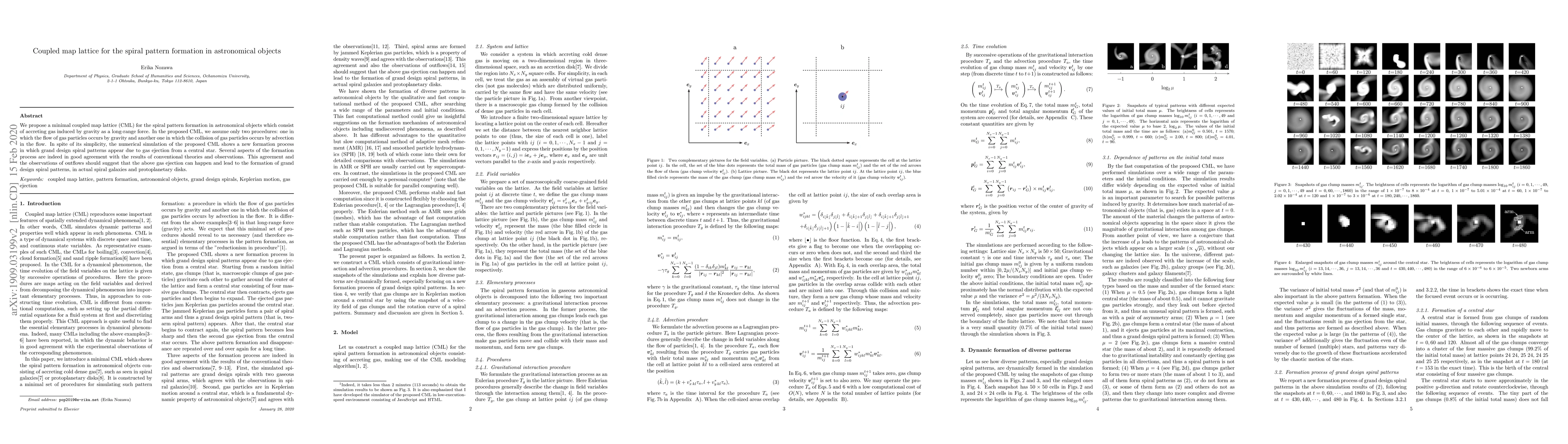 This paper proposes a simple coupled map lattice model to simulate spiral pattern formation in astronomical objects, driven by gravity and gas advection. The model's numerical simulations reveal a new mechanism for grand design spiral patterns due to gas ejection from a central star, aligning well with conventional theories and observations.