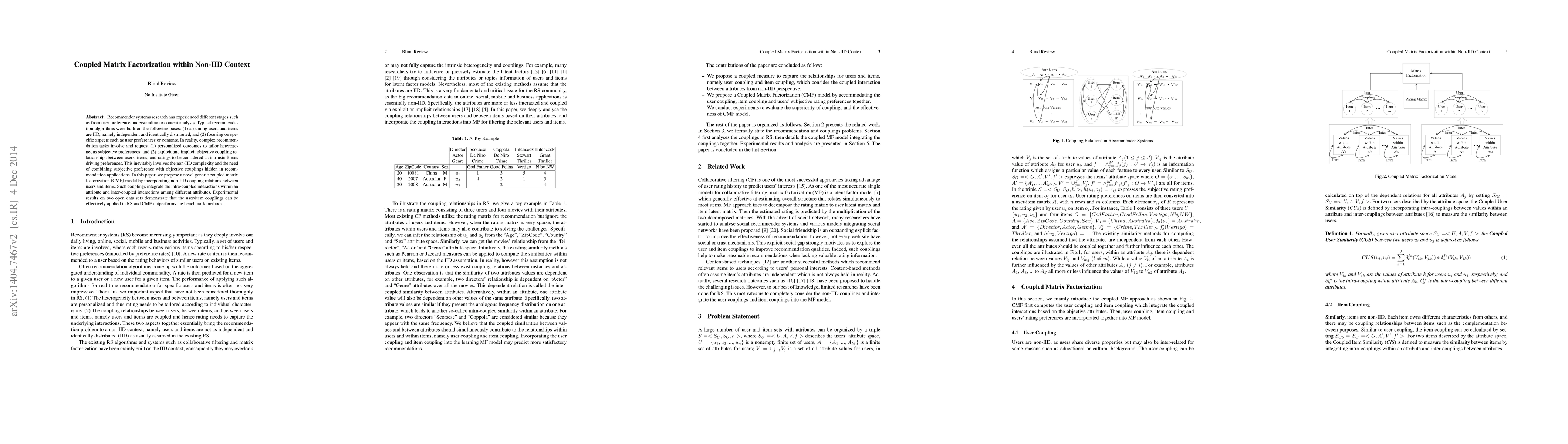 A new model called Coupled Matrix Factorization (CMF) is proposed to handle complex recommendation tasks with non-IID data, integrating subjective preferences and objective couplings between users and items.