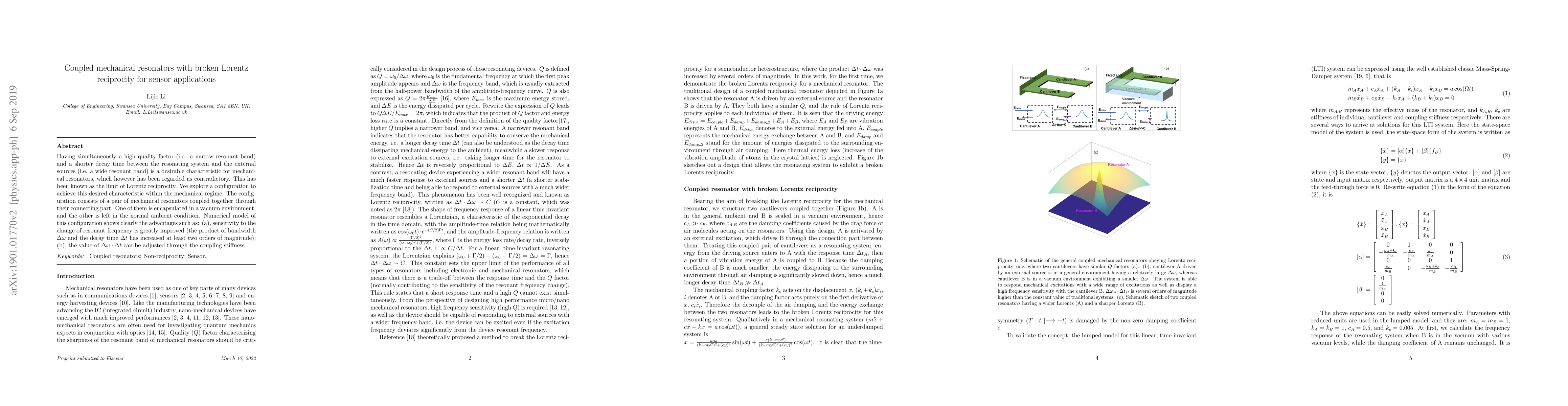 Having simultaneously a high quality factor (i.e. a narrow resonant band) and a shorter interaction time between the resonating system and the external sources (i.e. a wide resonant band) is a desirable characteristic for mechanical resonators, which however has been regarded as contradictory. This has been known as the limit of Lorentz reciprocity. We explore a configuration to achieve this desired characteristic within the mechanical regime. The configuration consists of a pair of mechanical resonators coupled together through their connecting part. One of them is encapsulated in a vacuum environment, and the other is left in the normal ambient condition. Numerical model of this configuration shows clearly the advantages such as: (a), sensitivity to the change of resonant frequency is greatly improved (the product of bandwidth $\Delta \omega$ and the interaction time $\Delta t$ has increased at least two orders of magnitude); (b), the value of $\Delta \omega \cdot \Delta t$ can be adjusted through the coupling stiffness.