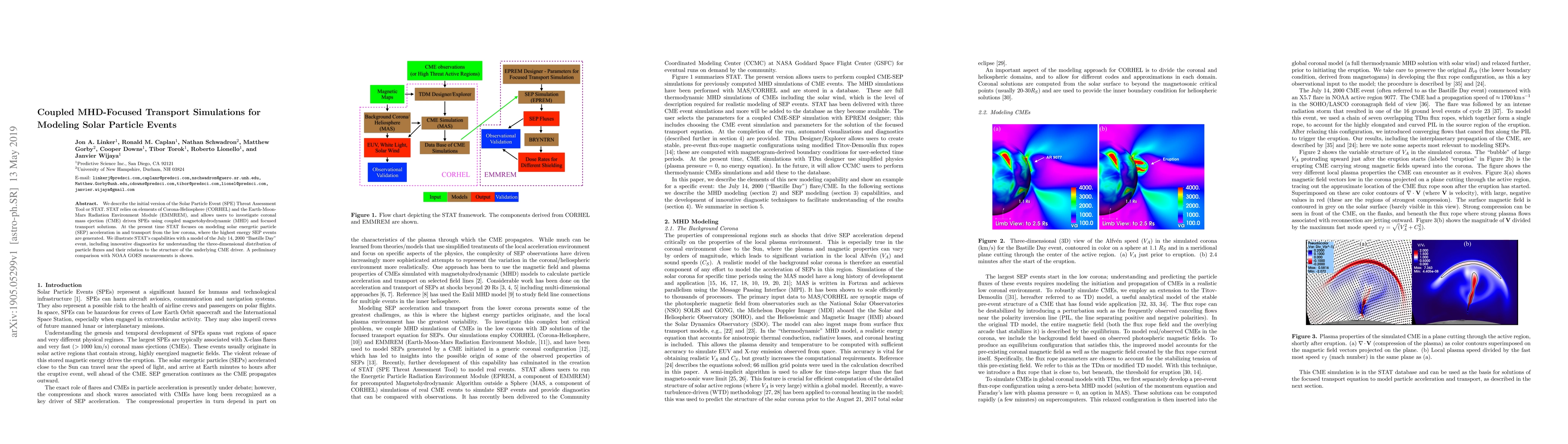 This paper introduces the Solar Particle Event Threat Assessment Tool (STAT), which combines magnetohydrodynamic (MHD) and focused transport simulations to model coronal mass ejection (CME) driven solar particle events. The tool focuses on solar energetic particle (SEP) acceleration and transport from the low corona, demonstrated through a detailed analysis of the Bastille Day event, and provides diagnostics for understanding particle flux distributions.