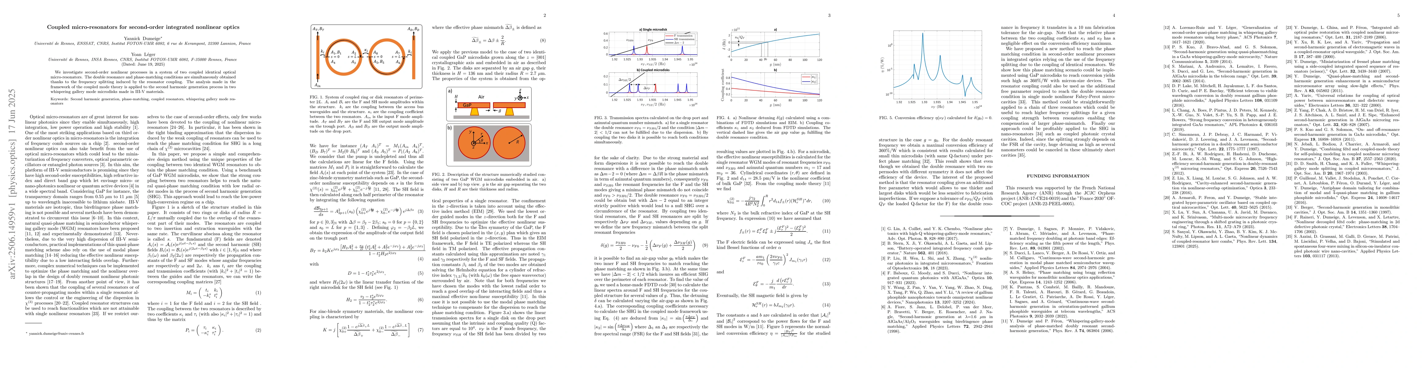 We investigate second-order nonlinear processes in a system of two coupled identical optical micro-resonators. The double resonance and phase-matching conditions are simultaneously obtained thanks to the frequency splitting induced by the resonator coupling. The analysis made in the framework of the coupled mode theory is applied to the second harmonic generation process in two whispering gallery mode microdisks made in III-V materials.