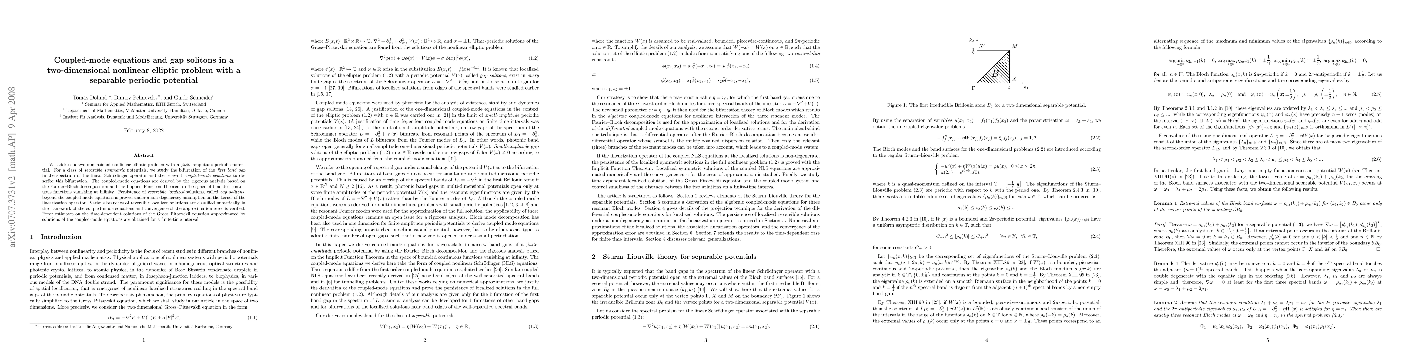 We address a two-dimensional nonlinear elliptic problem with a finite-amplitude periodic potential. For a class of separable symmetric potentials, we study the bifurcation of the first band gap in the spectrum of the linear Schr\"{o}dinger operator and the relevant coupled-mode equations to describe this bifurcation. The coupled-mode equations are derived by the rigorous analysis based on the Fourier--Bloch decomposition and the Implicit Function Theorem in the space of bounded continuous functions vanishing at infinity. Persistence of reversible localized solutions, called gap solitons, beyond the coupled-mode equations is proved under a non-degeneracy assumption on the kernel of the linearization operator. Various branches of reversible localized solutions are classified numerically in the framework of the coupled-mode equations and convergence of the approximation error is verified. Error estimates on the time-dependent solutions of the Gross--Pitaevskii equation and the coupled-mode equations are obtained for a finite-time interval.