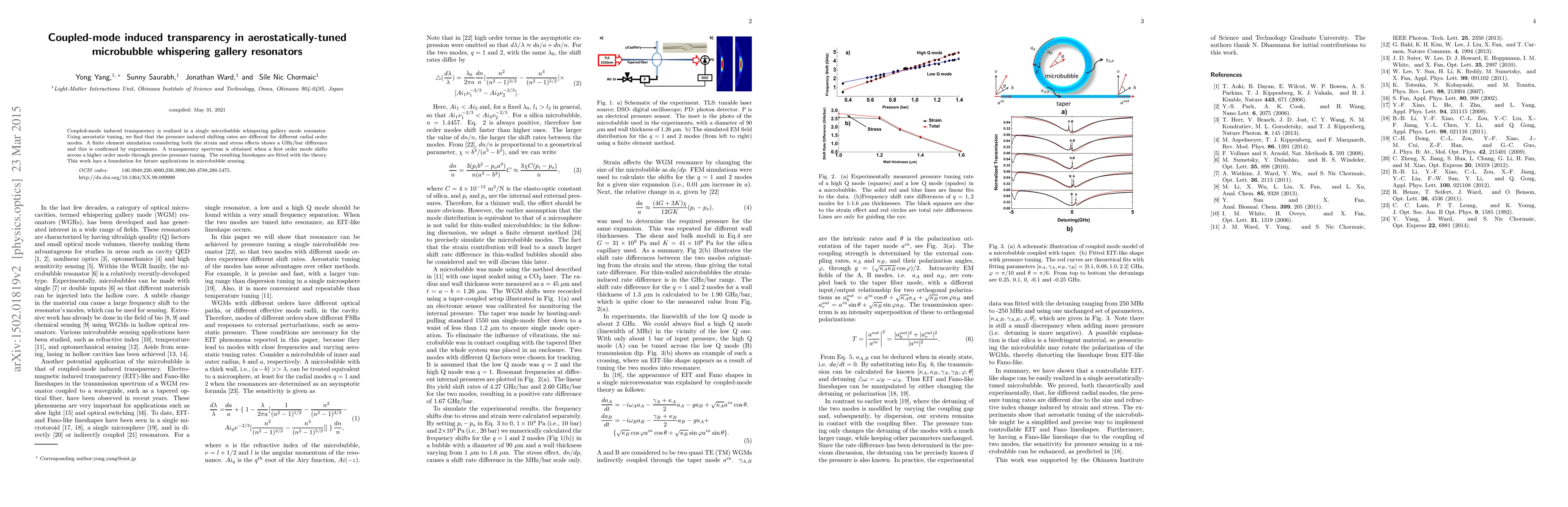 This paper demonstrates coupled-mode induced transparency in aerostatically-tuned microbubble whispering gallery mode resonators, showing different pressure-induced shifting rates for various radial modes. Experimental results and finite element simulations confirm a GHz/bar difference, paving the way for advanced microbubble sensing applications.