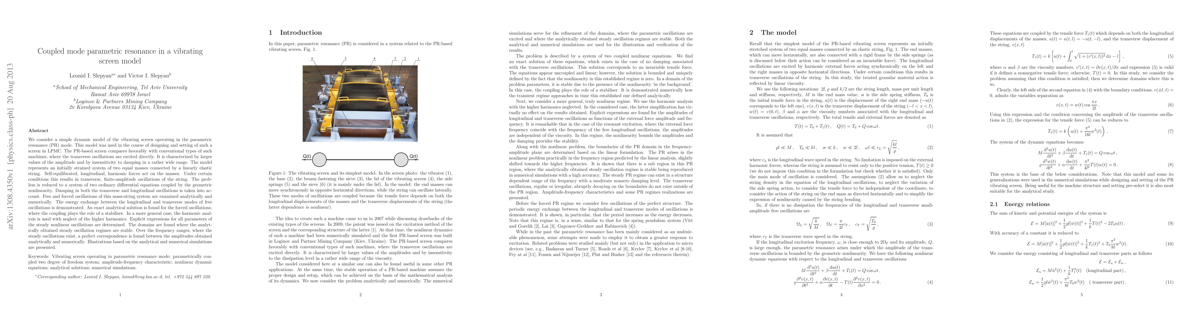 We consider a simple dynamic model of the vibrating screen operating in the parametric resonance (PR) mode. This model was used in the course of designing and setting of such a screen in LPMC. The PR-based screen compares favorably with conventional types of such machines, where the transverse oscillations are excited directly. It is characterized by larger values of the amplitude and by insensitivity to damping in a rather wide range. The model represents an initially strained system of two equal masses connected by a linearly elastic string. Self-equilibrated, longitudinal, harmonic forces act on the masses. Under certain conditions this results in transverse, finite-amplitude oscillations of the string. The problem is reduced to a system of two ordinary differential equations coupled by the geometric nonlinearity. Damping in both the transverse and longitudinal oscillations is taken into account. Free and forced oscillations of this mass-string system are examined analytically and numerically. The energy exchange between the longitudinal and transverse modes of free oscillations is demonstrated. An exact analytical solution is found for the forced oscillations, where the coupling plays the role of a stabilizer. In a more general case, the harmonic analysis is used with neglect of the higher harmonics. Explicit expressions for all parameters of the steady nonlinear oscillations are determined. The domains are found where the analytically obtained steady oscillation regimes are stable. Over the frequency ranges, where the steady oscillations exist, a perfect correspondence is found between the amplitudes obtained analytically and numerically. Illustrations based on the analytical and numerical simulations are presented.
