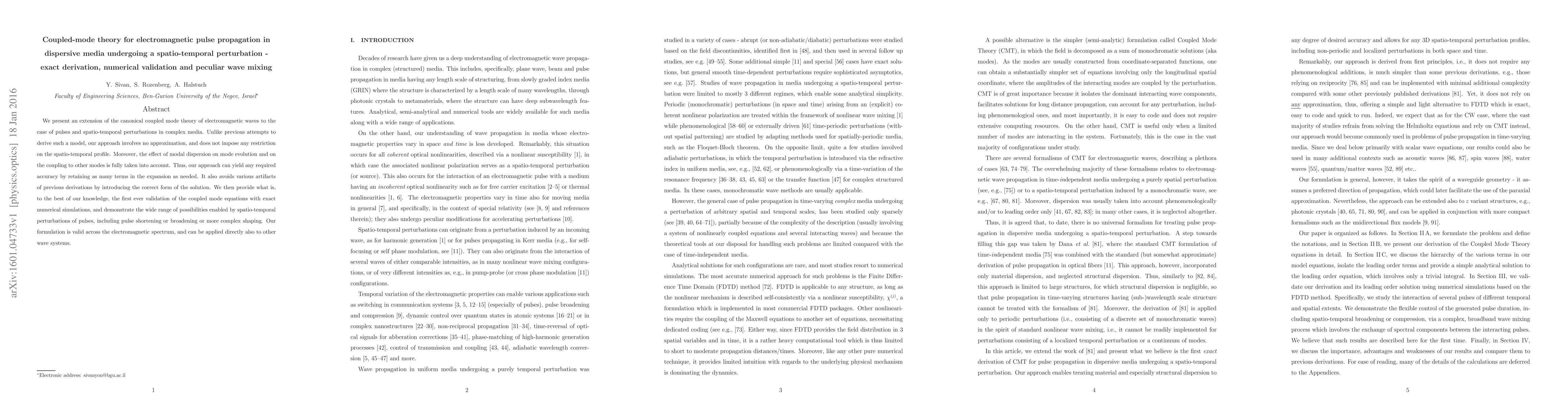 This paper extends coupled-mode theory to accurately model electromagnetic pulse propagation in dispersive media with spatio-temporal perturbations, providing an exact derivation without approximations. It also validates the theory with numerical simulations, demonstrating its ability to shape pulses.