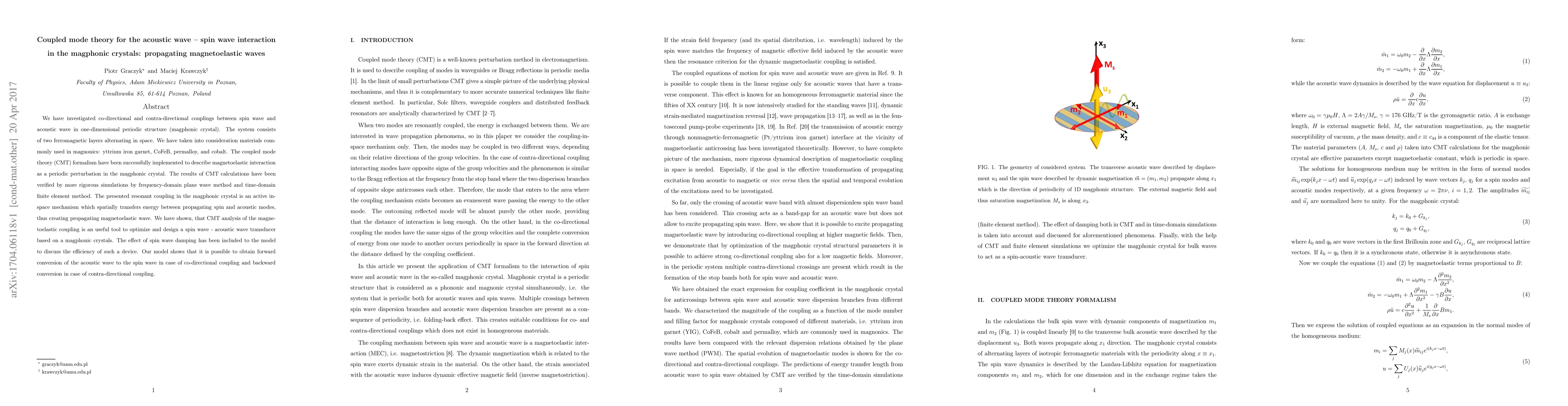 We have investigated co-directional and contra-directional couplings between spin wave and acoustic wave in one-dimensional periodic structure (magphonic crystal). The system consists of two ferromagnetic layers alternating in space. We have taken into consideration materials commonly used in magnonics: yttrium iron garnet, CoFeB, permalloy, and cobalt. The coupled mode theory (CMT) formalism have been successfully implemented to describe magnetoelastic interaction as a periodic perturbation in the magphonic crystal. The results of CMT calculations have been verified by more rigorous simulations by frequency-domain plane wave method and time-domain finite element method. The presented resonant coupling in the magphonic crystal is an active in-space mechanism which spatially transfers energy between propagating spin and acoustic modes, thus creating propagating magnetoelastic wave. We have shown, that CMT analysis of the magnetoelastic coupling is an useful tool to optimize and design a spin wave - acoustic wave transducer based on a magphonic crystals. The effect of spin wave damping has been included to the model to discuss the efficiency of such a device. Our model shows that it is possible to obtain forward conversion of the acoustic wave to the spin wave in case of co-directional coupling and backward conversion in case of contra-directional coupling.
