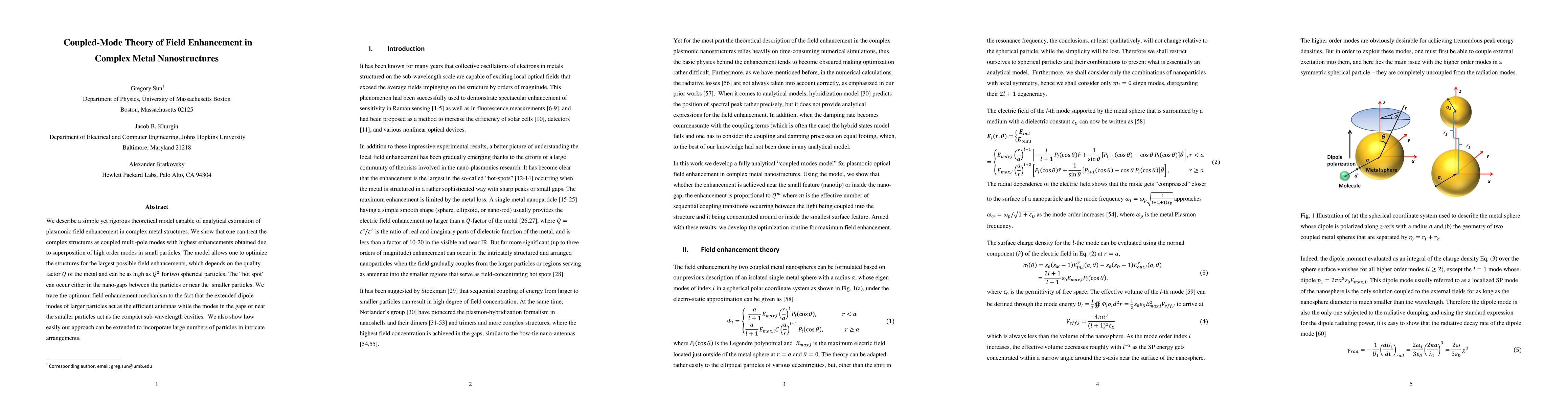 We describe a simple yet rigorous theoretical model capable of analytical estimation of plasmonic field enhancement in complex metal structures. We show that one can treat the complex structures as coupled multi-pole modes with highest enhancements obtained due to superposition of high order modes in small particles. The model allows one to optimize the structures for the largest possible field enhancements, which depends on the quality factor Q of the metal and can be as high as Q^2 for two spherical particles. The "hot spot" can occur either in the nano-gaps between the particles or near the smaller particles. We trace the optimum field enhancement mechanism to the fact that the extended dipole modes of larger particles act as the efficient antennas while the modes in the gaps or near the smaller particles act as the compact sub-wavelength cavities. We also show how easily our approach can be extended to incorporate large numbers of particles in intricate arrangements.
