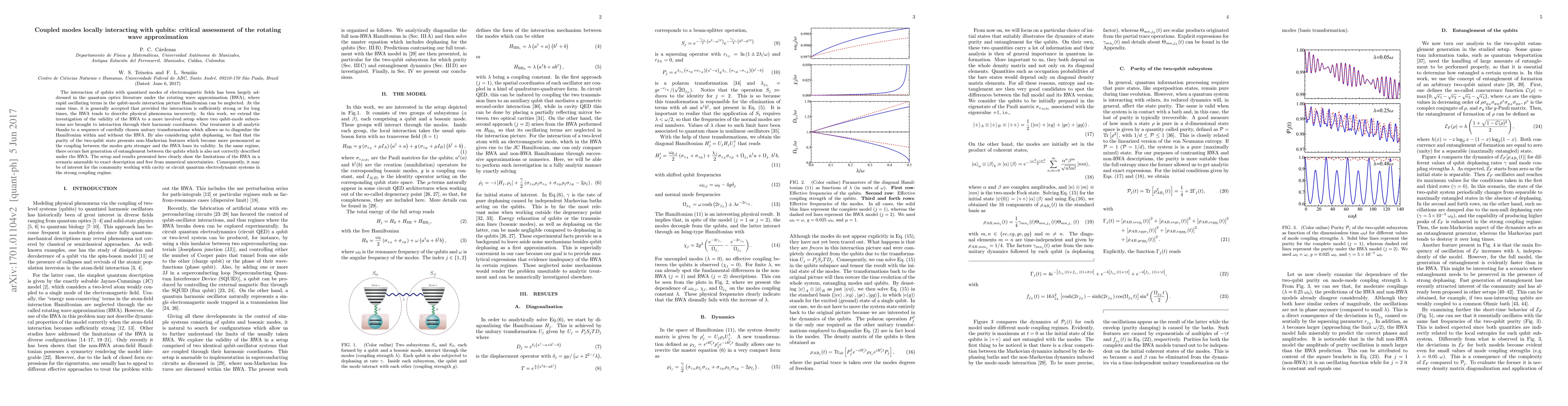 The interaction of qubits with quantized modes of electromagnetic fields has been largely addressed in the quantum optics literature under the rotating wave approximation (RWA), where rapid oscillating terms in the qubit-mode interaction picture Hamiltonian can be neglected. At the same time, it is generally accepted that provided the interaction is sufficiently strong or for long times, the RWA tends to describe physical phenomena incorrectly. In this work, we extend the investigation of the validity of the RWA to a more involved setup where two qubit-mode subsystems are brought to interaction through their harmonic coordinates. Our treatment is all analytic thanks to a sequence of carefully chosen unitary transformations which allows us to diagonlize the Hamiltonian within and without the RWA. By also considering qubit dephasing, we find that the purity of the two-qubit state presents non-Markovian features which become more pronounced as the coupling between the modes gets stronger and the RWA loses its validity. In the same regime, there occurs fast generation of entanglement between the qubits which is also not correctly described under the RWA. The setup and results presented here clearly show the limitations of the RWA in a scenario amenable to exact description and free from numerical uncertainties. Consequently, it may be of interest for the community working with cavity or circuit quantum electrodynamic systems in the strong coupling regime.