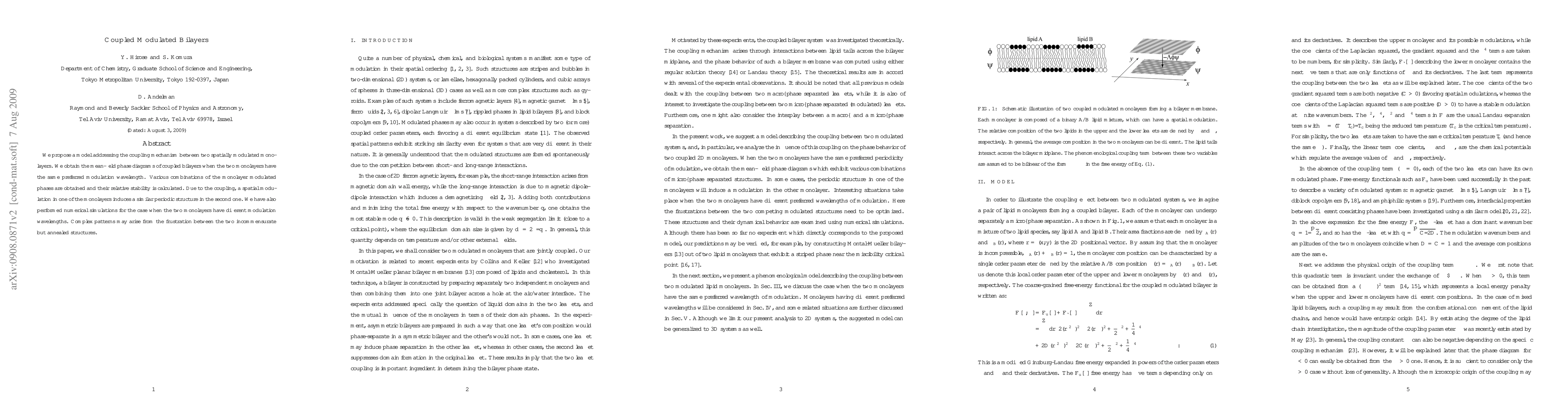 This paper proposes a model to study the coupling mechanism between two spatially modulated monolayers, deriving mean-field phase diagrams for bilayers with identical modulation wavelengths. It explores the relative stability of various modulated phases and investigates complex patterns arising from frustration when modulation wavelengths differ.