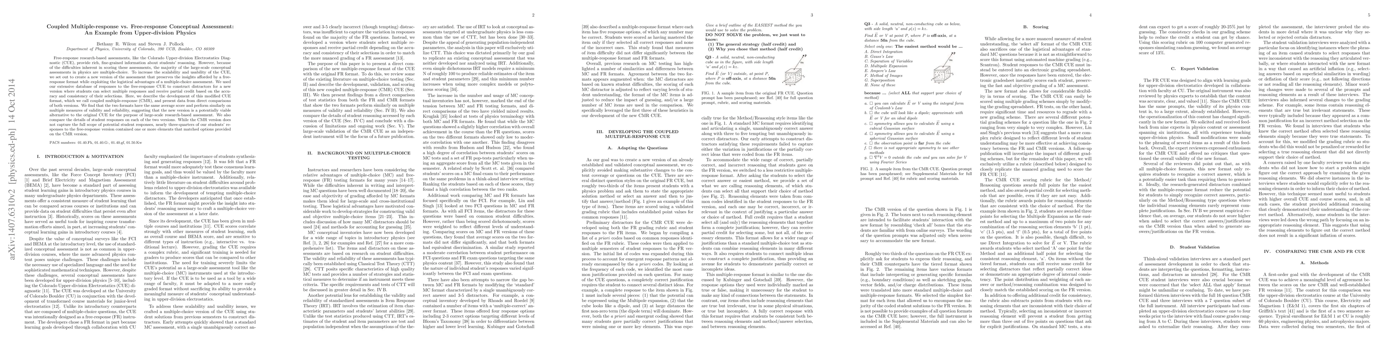 This paper develops a coupled multiple-response (CMR) version of the Colorado Upper-division Electrostatics Diagnostic (CUE) to balance the rich insights of free-response assessments with the scalability of multiple-choice formats. The CMR version shows similar validity and reliability to the original free-response CUE, indicating it could serve as a viable alternative for large-scale assessments.