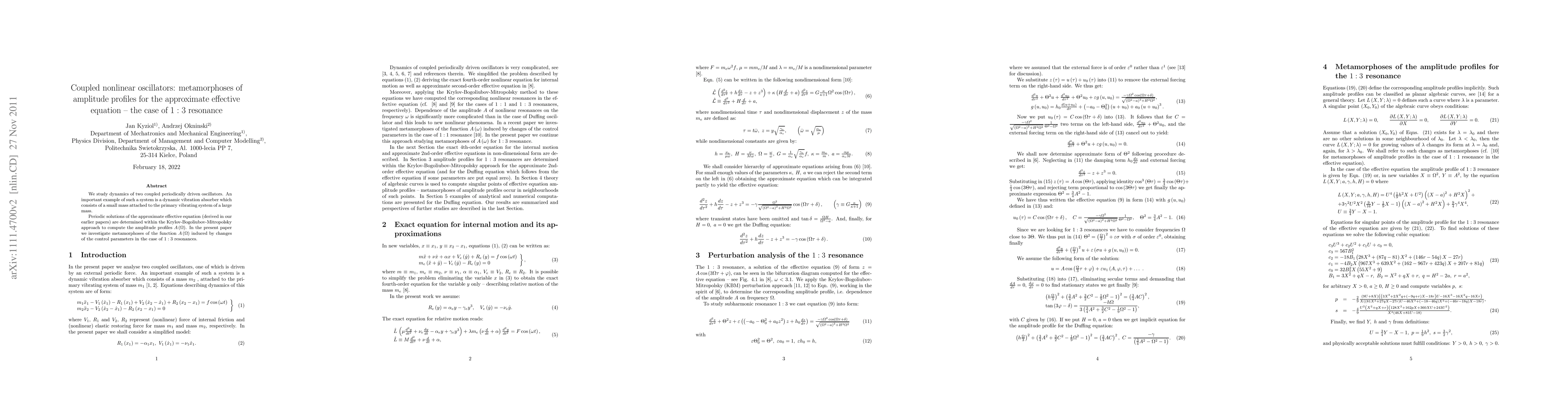 We study dynamics of two coupled periodically driven oscillators. An important example of such a system is a dynamic vibration absorber which consists of a small mass attached to the primary vibrating system of a large mass. Periodic solutions of the approximate effective equation (derived in our earlier papers) are determined within the Krylov-Bogoliubov-Mitropolsky approach to compute the amplitude profiles $A(\Omega)$. In the present paper we investigate metamorphoses of the function $A(\Omega)$ induced by changes of the control parameters in the case of 1:3 resonances.