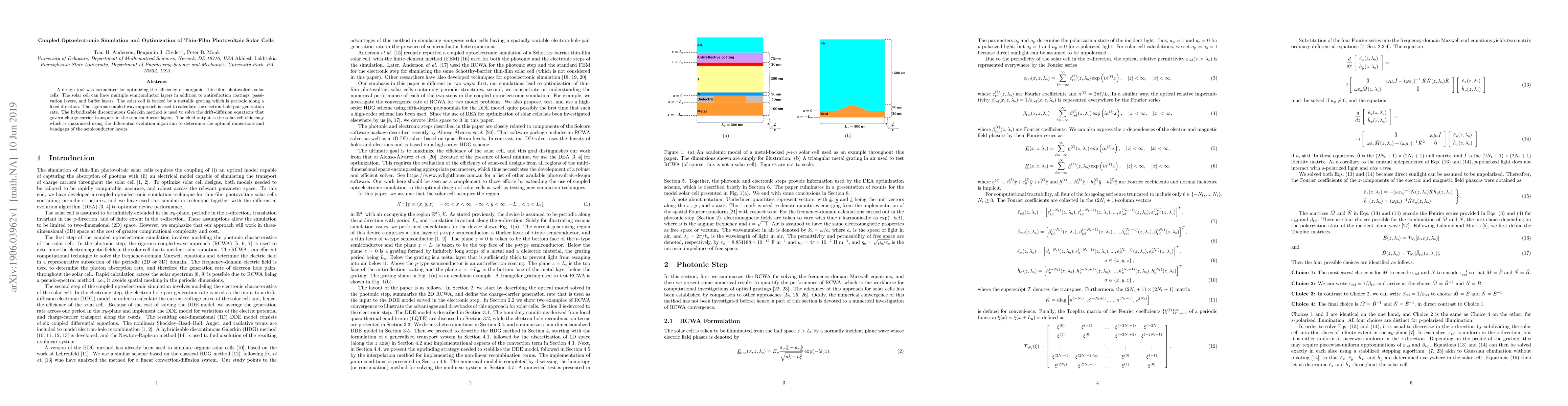 This paper presents a design tool for optimizing the efficiency of inorganic, thin-film photovoltaic solar cells using coupled optoelectronic simulation. The tool maximizes solar-cell efficiency through the differential evolution algorithm, considering multiple semiconductor layers and various coatings, and employs rigorous coupled-wave and hybridizable discontinuous Galerkin methods for simulation.