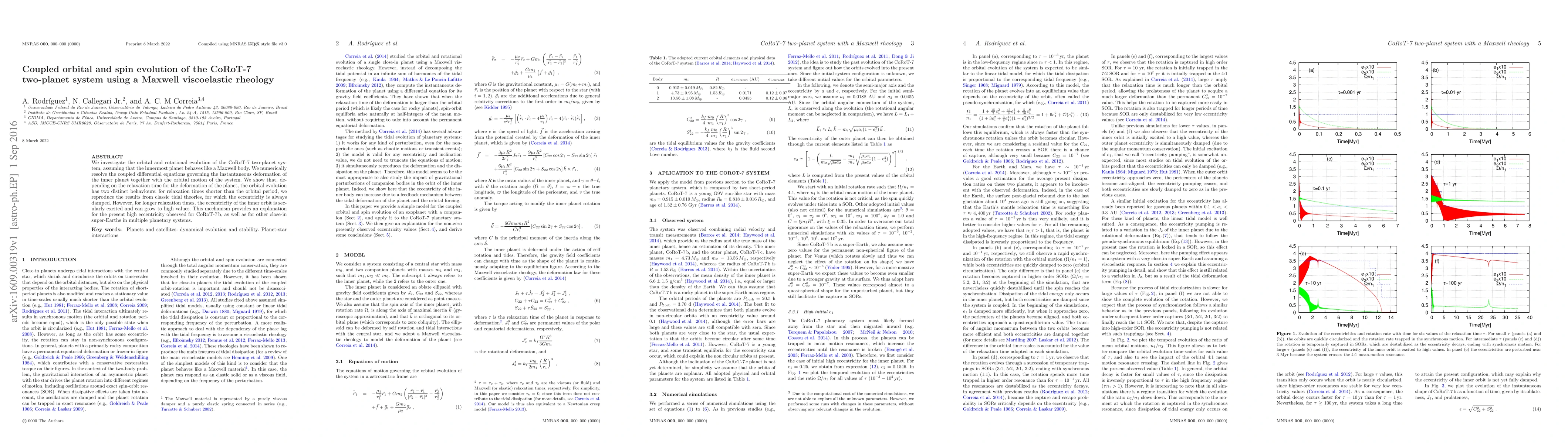 We investigate the orbital and rotational evolution of the CoRoT-7 two-planet system, assuming that the innermost planet behaves like a Maxwell body. We numerically resolve the coupled differential equations governing the instantaneous deformation of the inner planet together with the orbital motion of the system. We show that, depending on the relaxation time for the deformation of the planet, the orbital evolution has two distinct behaviours: for relaxation times shorter than the orbital period, we reproduce the results from classic tidal theories, for which the eccentricity is always damped. However, for longer relaxation times, the eccentricity of the inner orbit is secularly excited and can grow to high values. This mechanism provides an explanation for the present high eccentricity observed for CoRoT-7 b, as well as for other close-in super-Earths in multiple planetary systems.