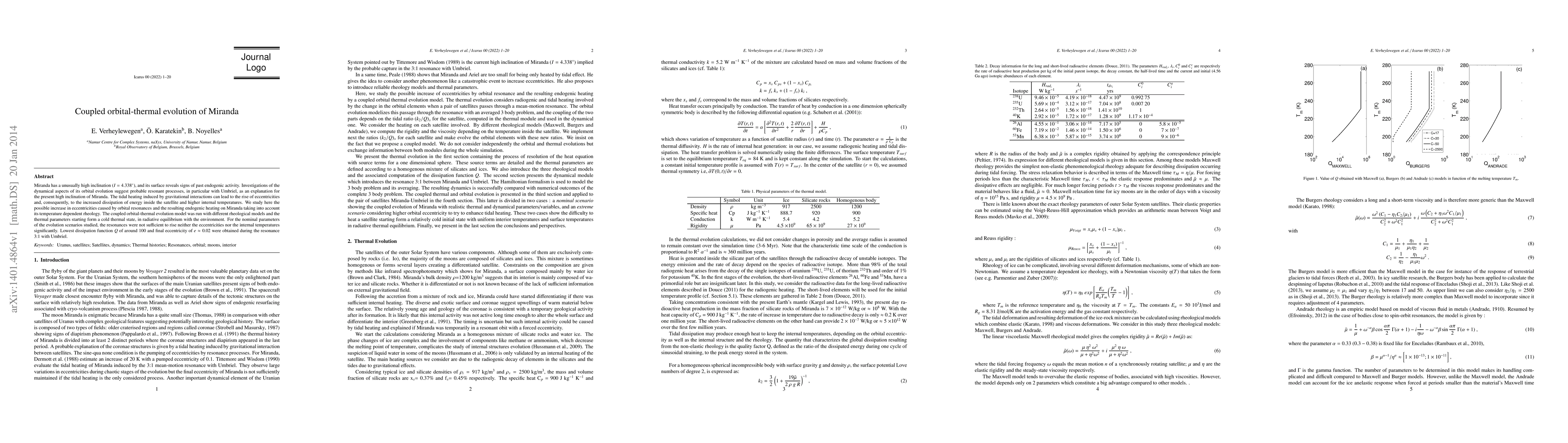 Miranda has a unusually high inclination ($I=4.338^\circ$), and its surface reveals signs of past endogenic activity. Investigations of the dynamical aspects of its orbital evolution suggest probable resonant processes, in particular with Umbriel, as an explanation for the present high inclination of Miranda. The tidal heating induced by gravitational interactions can lead to the rise of eccentricities and, consequently, to the increased dissipation of energy inside the satellite and higher internal temperatures. We study here the possible increase in eccentricities caused by orbital resonances and the resulting endogenic heating on Miranda taking into account its temperature dependent rheology. The coupled orbital-thermal evolution model was run with different rheological models and the thermal parameters starting form a cold thermal state, in radiative equilibrium with the environment. For the nominal parameters of the evolution scenarios studied, the resonances were not sufficient to rise neither the eccentricities nor the internal temperatures significantly. Lowest dissipation function $Q$ of around 100 and final eccentricity of $e\approx0.02$ were obtained during the resonance 3:1 with Umbriel.