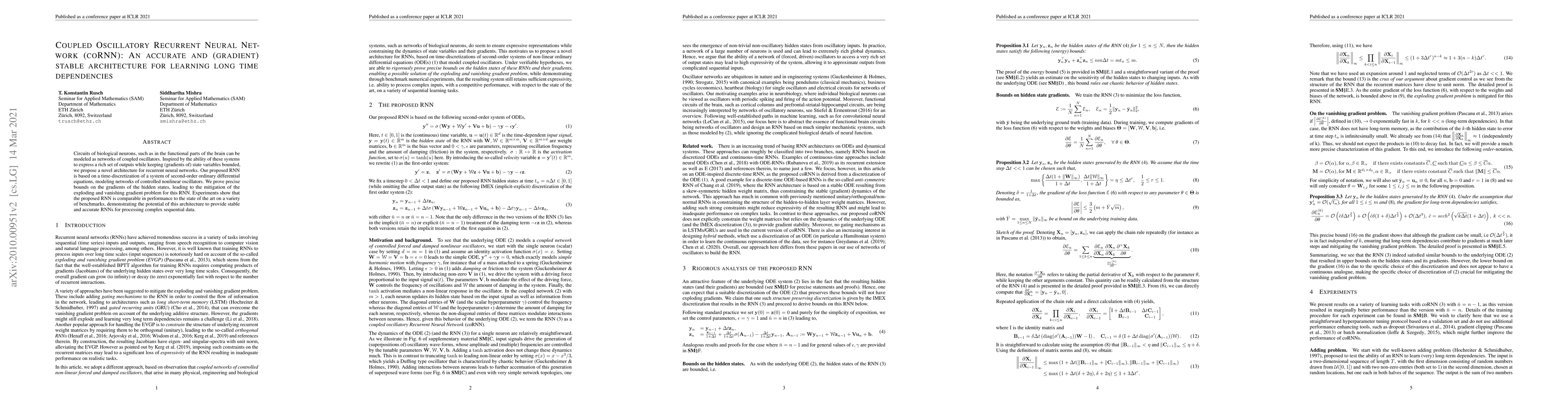 Researchers propose a new neural network architecture called coRNN, which uses coupled oscillators to learn long-term dependencies without exploding or vanishing gradients, achieving comparable performance to state-of-the-art RNNs on various benchmarks.