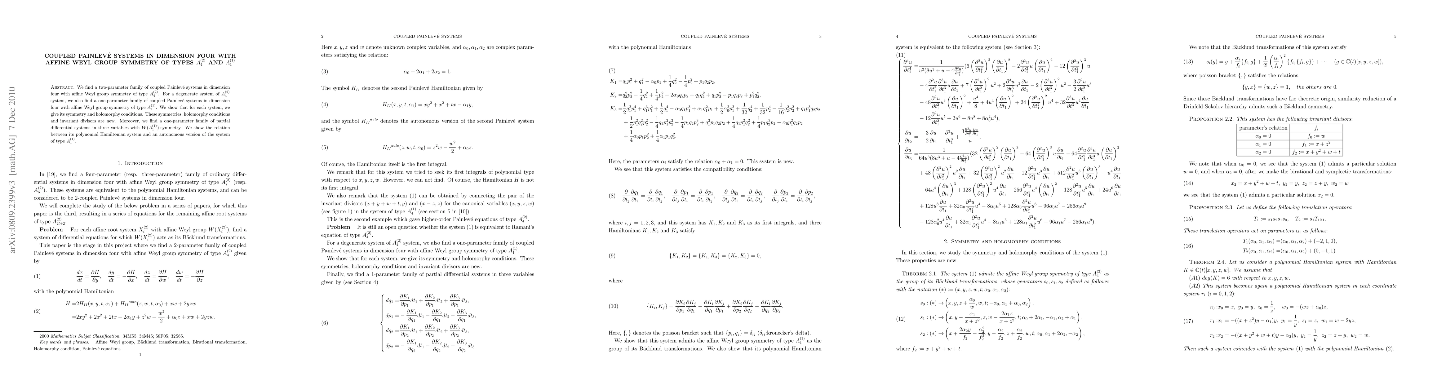This paper identifies a two-parameter family of coupled Painlevé systems in dimension four with $A_4^{(2)}$ symmetry and a degenerate case yielding a one-parameter family with $A_1^{(1)}$ symmetry. It presents new symmetry, holomorphy conditions, and invariant divisors for these systems.