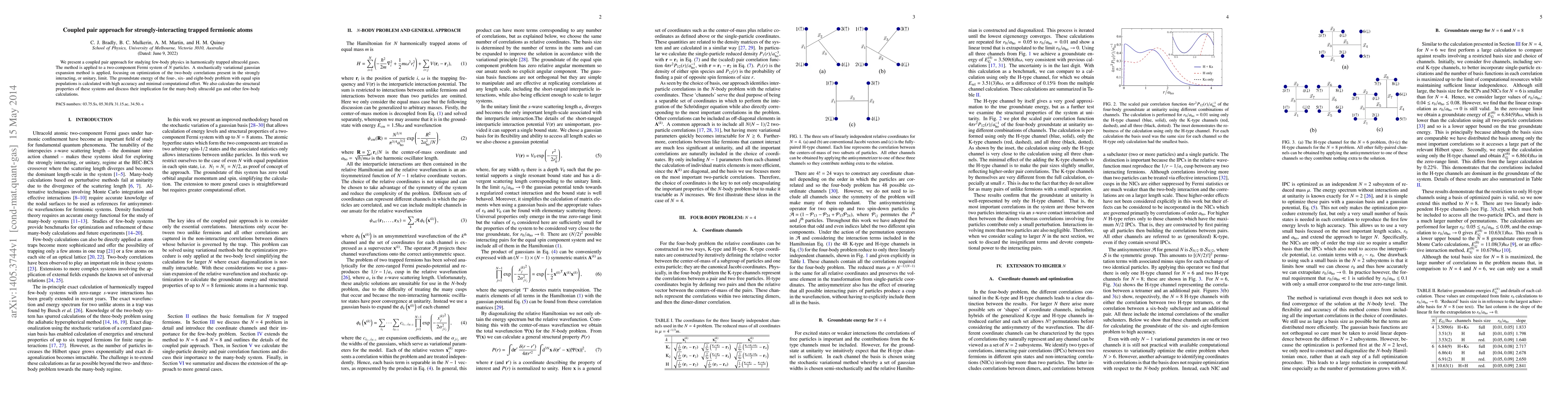 We present a coupled pair approach for studying few-body physics in harmonically trapped ultracold gases. The method is applied to a two-component Fermi system of $N$ particles. A stochastically variational gaussian expansion method is applied, focusing on optimization of the two-body correlations present in the strongly interacting, or unitary, limit. The groundstate energy of the four-, six- and eight-body problem with equal spin populations is calculated with high accuracy and minimal computational effort. We also calculate the structural properties of these systems and discuss their implication for the many-body ultracold gas and other few-body calculations.