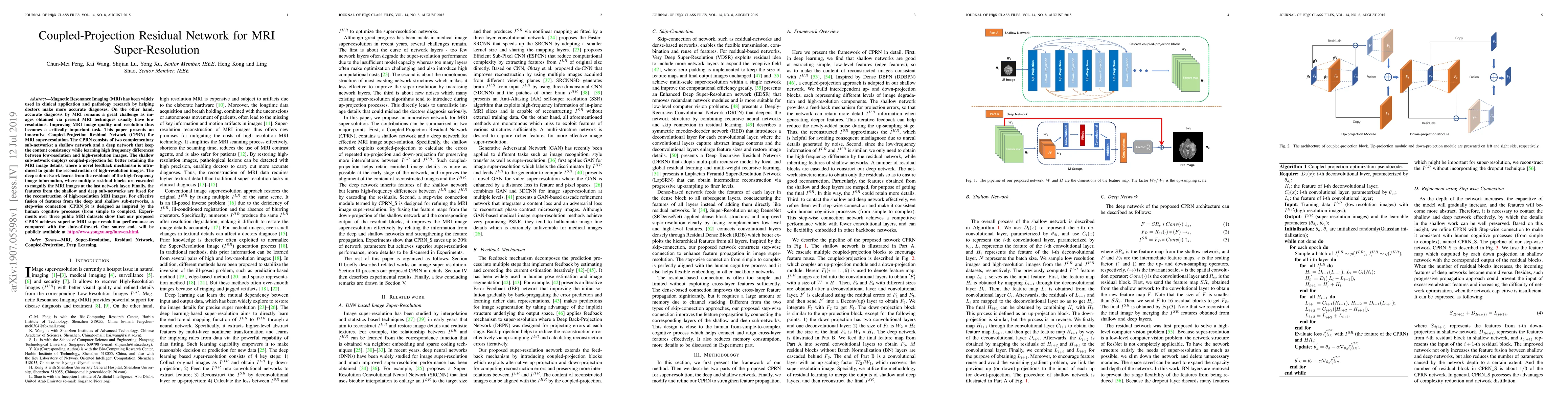 This paper introduces a Coupled-Projection Residual Network (CPRN) for MRI super-resolution, consisting of a shallow network with coupled-projection for detail retention and a deep network with residual blocks for high-frequency information. The CPRN achieves superior MRI super-resolution performance compared to state-of-the-art methods, as demonstrated on three public datasets.