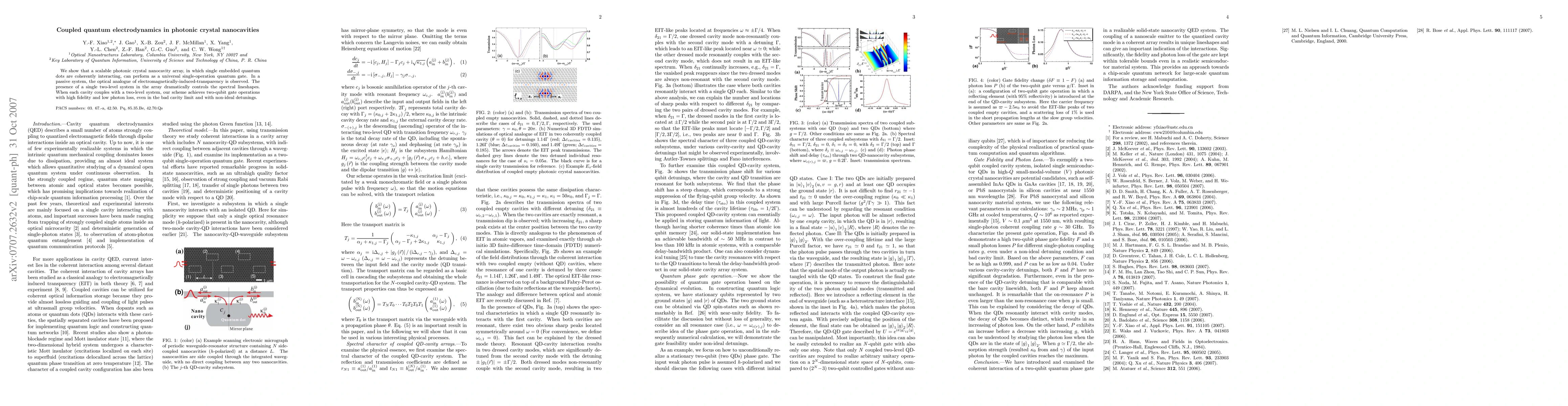 This research demonstrates a scalable photonic crystal nanocavity array that enables universal quantum gate operations via coherent interactions between embedded quantum dots, achieving high fidelity two-qubit gate operations with low photon loss, even under non-ideal conditions. The passive optical analogue of electromagnetically-induced transparency is also observed.