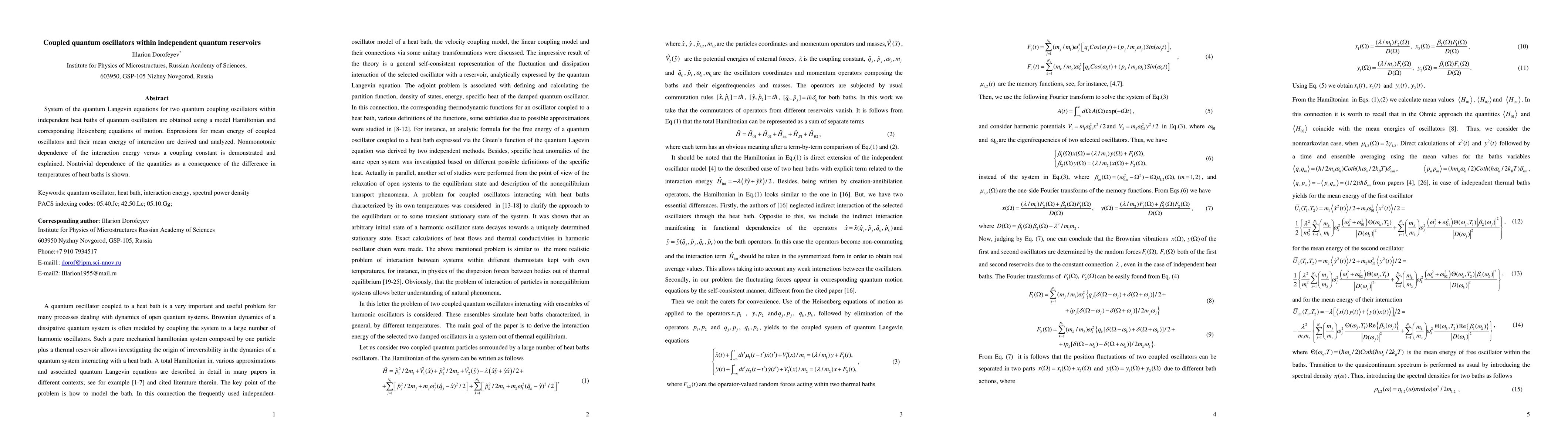 Researchers studied quantum oscillators connected to independent heat baths, finding nonmonotonic energy interaction dependence on a coupling constant and temperature differences between heat baths.