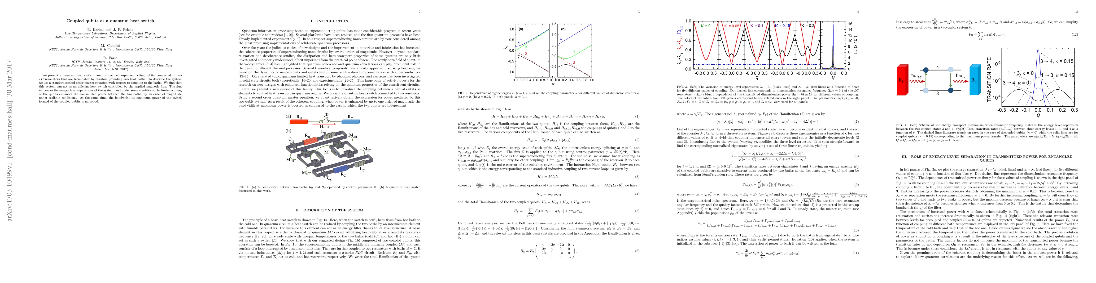 This paper proposes a quantum heat switch utilizing coupled superconducting qubits connected to two resonators, demonstrating that it can efficiently control heat transfer between two reservoirs via applied magnetic flux, significantly enhancing heat transmission power under certain conditions. The system's bandwidth narrows at maximum power transmission.