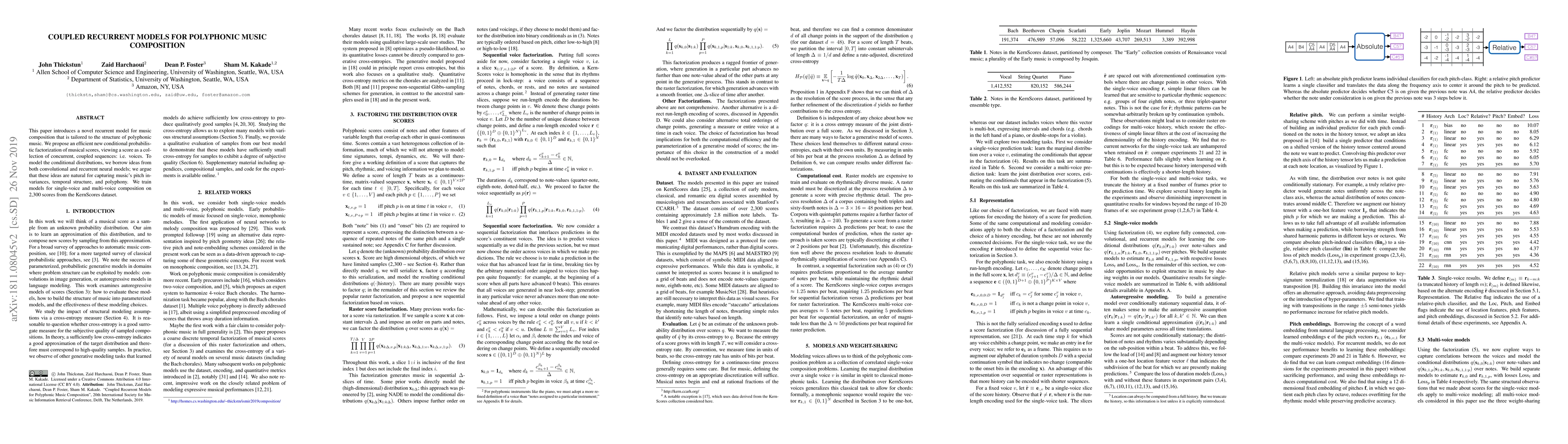 This paper proposes a novel recurrent model for polyphonic music composition using a conditional probabilistic factorization of musical scores into coupled sequences representing voices. The model combines convolutional and recurrent neural network ideas to capture pitch invariances, temporal structure, and polyphony, and is trained on 2,300 scores from the KernScores dataset.