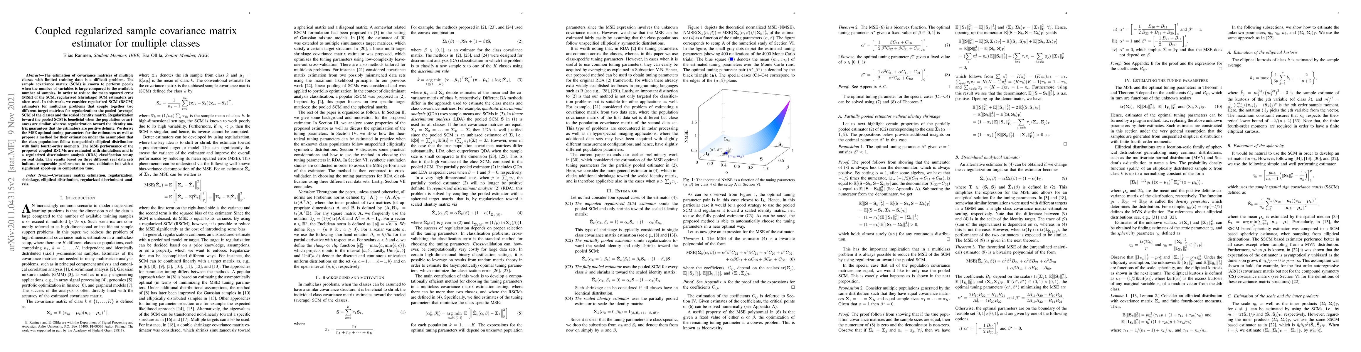 This paper proposes a coupled regularized sample covariance matrix estimator for multiple classes, combining regularization towards the pooled SCM and the scaled identity matrix to improve mean squared error. The method is evaluated through simulations and real data, showing comparable performance to cross-validation with faster computation.
