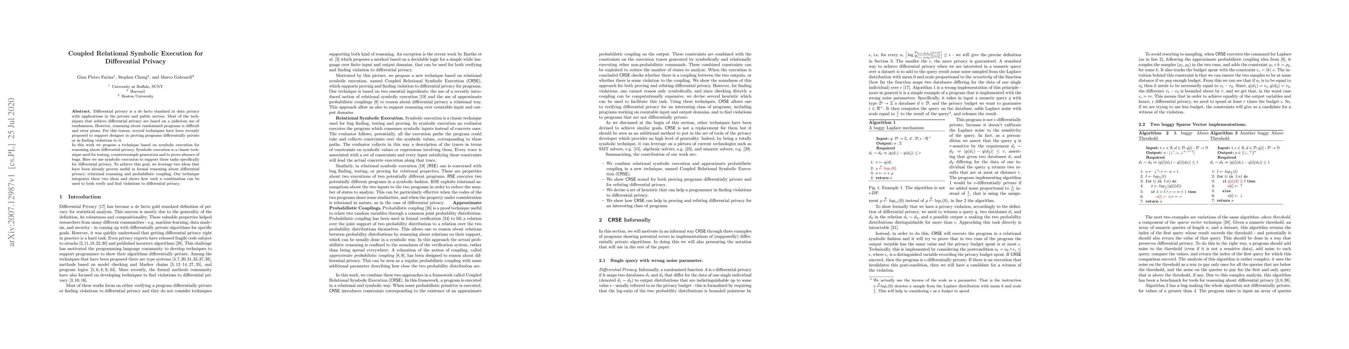 This paper proposes a novel technique using coupled relational symbolic execution to reason about differential privacy, integrating relational reasoning and probabilistic coupling to verify privacy guarantees and identify violations in randomized programs.