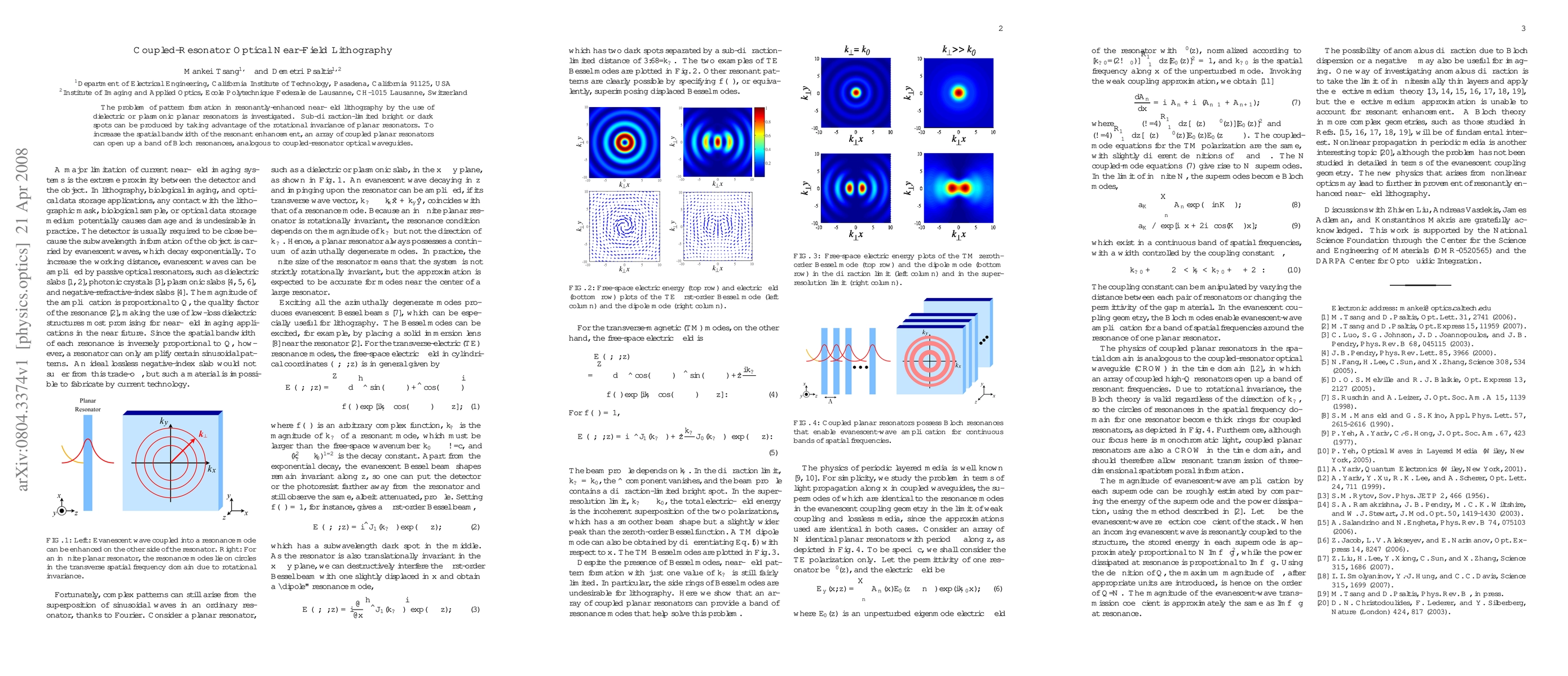 The problem of pattern formation in resonantly-enhanced near-field lithography by the use of dielectric or plasmonic planar resonators is investigated. Sub-diffraction-limited bright or dark spots can be produced by taking advantage of the rotational invariance of planar resonators. To increase the spatial bandwidth of the resonant enhancement, an array of coupled planar resonators can open up a band of Bloch resonances, analogous to coupled-resonator optical waveguides.