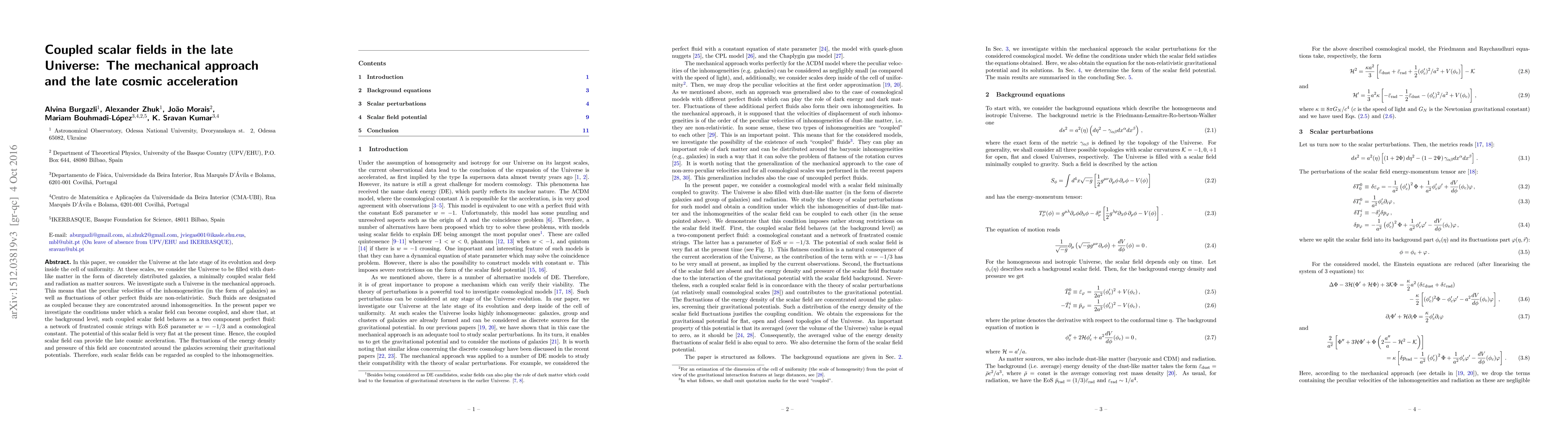 In this paper, we consider the Universe at the late stage of its evolution and deep inside the cell of uniformity. At these scales, we consider the Universe to be filled with dust-like matter in the form of discretely distributed galaxies, a minimally coupled scalar field and radiation as matter sources. We investigate such a Universe in the mechanical approach. This means that the peculiar velocities of the inhomogeneities (in the form of galaxies) as well as fluctuations of other perfect fluids are non-relativistic. Such fluids are designated as coupled because they are concentrated around inhomogeneities. In the present paper we investigate the conditions under which a scalar field can become coupled, and show that, at the background level, such coupled scalar field behaves as a two component perfect fluid: a network of frustrated cosmic strings with EoS parameter $w=-1/3$ and a cosmological constant. The potential of this scalar field is very flat at the present time. Hence, the coupled scalar field can provide the late cosmic acceleration. The fluctuations of the energy density and pressure of this field are concentrated around the galaxies screening their gravitational potentials. Therefore, such scalar fields can be regarded as coupled to the inhomogeneities.