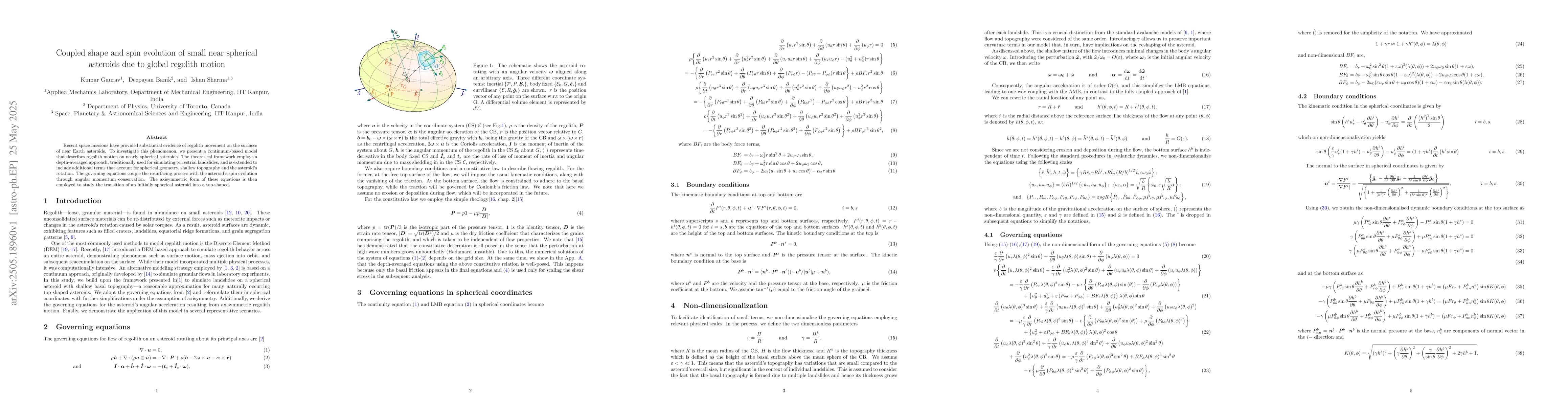 The extension of depth-averaged landslide models to spherical geometry and integration with asteroid spin dynamics constitutes the main technical contribution.