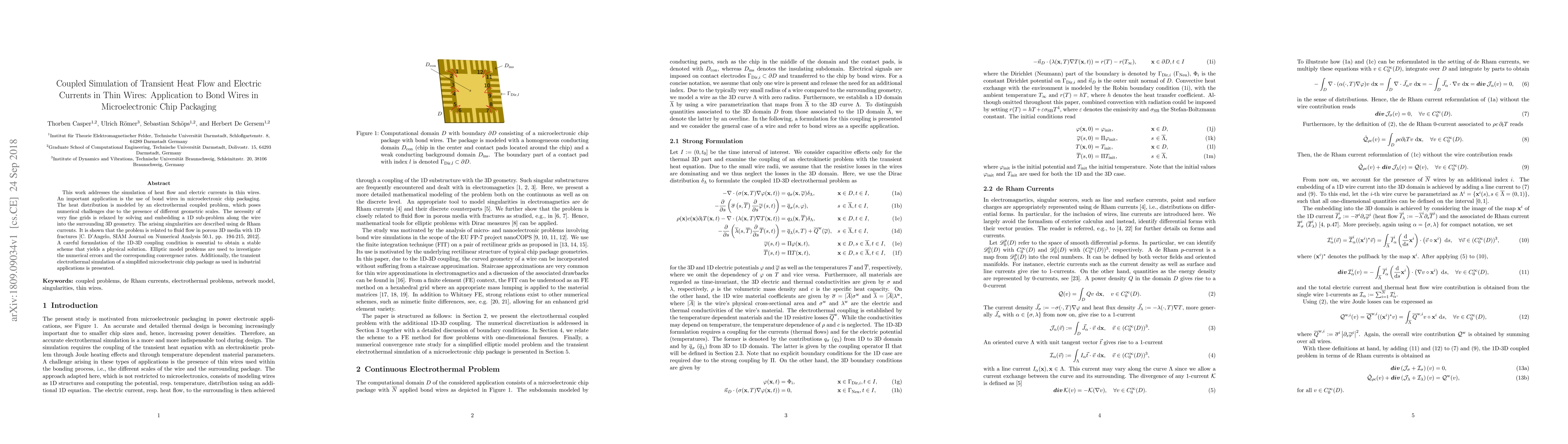 This paper simulates transient heat flow and electric currents in thin wires, focusing on bond wires in microelectronic chip packaging. It employs a coupled electrothermal model, embedding a 1D sub-problem to address numerical challenges, and uses de Rham currents to manage singularities, achieving a stable scheme for physical solutions.
