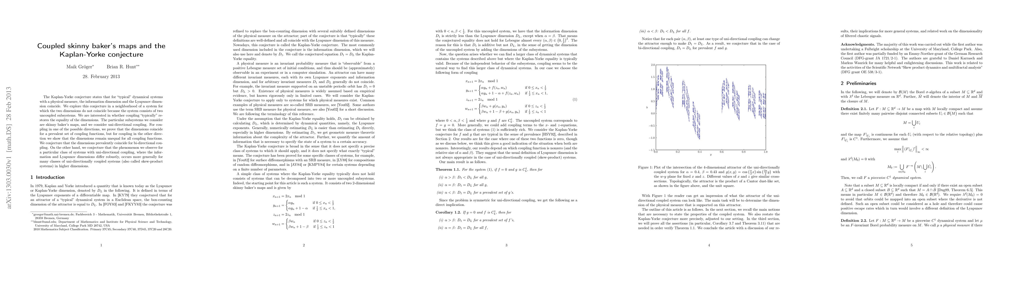 The Kaplan-Yorke conjecture states that for "typical" dynamical systems with a physical measure, the information dimension and the Lyapunov dimension coincide. We explore this conjecture in a neighborhood of a system for which the two dimensions do not coincide because the system consists of two uncoupled subsystems. We are interested in whether coupling "typically" restores the equality of the dimensions. The particular subsystems we consider are skinny baker's maps, and we consider uni-directional coupling. For coupling in one of the possible directions, we prove that the dimensions coincide for a prevalent set of coupling functions, but for coupling in the other direction we show that the dimensions remain unequal for all coupling functions. We conjecture that the dimensions prevalently coincide for bi-directional coupling. On the other hand, we conjecture that the phenomenon we observe for a particular class of systems with uni-directional coupling, where the information and Lyapunov dimensions differ robustly, occurs more generally for many classes of uni-directionally coupled systems (also called skew-product systems) in higher dimensions.