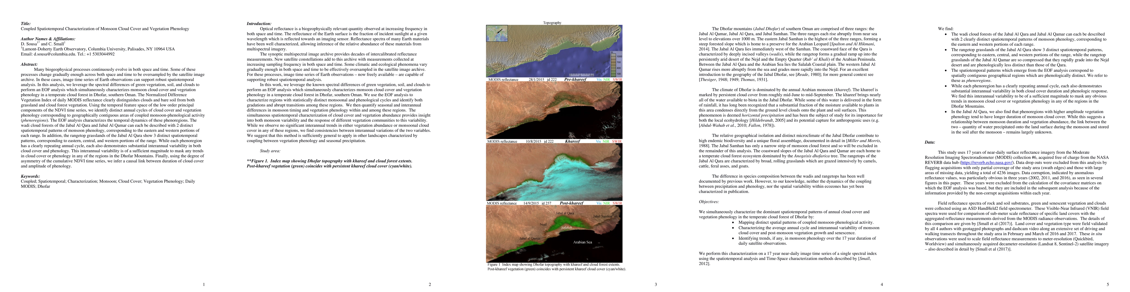 Many biogeophysical processes continuously evolve in both space and time. Some of these processes change gradually enough across both space and time to be oversampled by the satellite image archive. In these cases, image time series of Earth observations can support robust spatiotemporal analysis. In this analysis, we leverage the spectral differences of green vegetation, soil, and clouds to perform an EOF analysis which simultaneously characterizes monsoon cloud cover and vegetation phenology in a temperate cloud forest in Dhofar, southern Oman. The Normalized Difference Vegetation Index of daily MODIS reflectance clearly distinguishes clouds and bare soil from both grassland and cloud forest vegetation. Using the temporal feature space of the low order principal components of the NDVI time series, we identify distinct annual cycles of cloud cover and vegetation phenology corresponding to geographically contiguous areas of coupled monsoon-phenological activity (phenoregions). The EOF analysis characterizes the temporal dynamics of these phenoregions. The wadi cloud forests of the Jabal Al Qara and Jabal Al Qamar can each be described with 2 distinct spatiotemporal patterns of monsoon phenology, corresponding to the eastern and western portions of each range. In addition, the rangetop grasslands of the Jabal Al Qara show 3 distinct spatiotemporal patterns, corresponding to eastern, central, and western portions of the range. While each phenoregion has a clearly repeating annual cycle, each also demonstrates substantial interannual variability in both cloud cover and phenology. This interannual variability is of a sufficient magnitude to mask any trends in cloud cover or phenology in any of the regions in the Dhofar Mountains. Finally, using the degree of asymmetry of the cumulative NDVI time series, we infer a causal link between duration of cloud cover and amplitude of phenology.