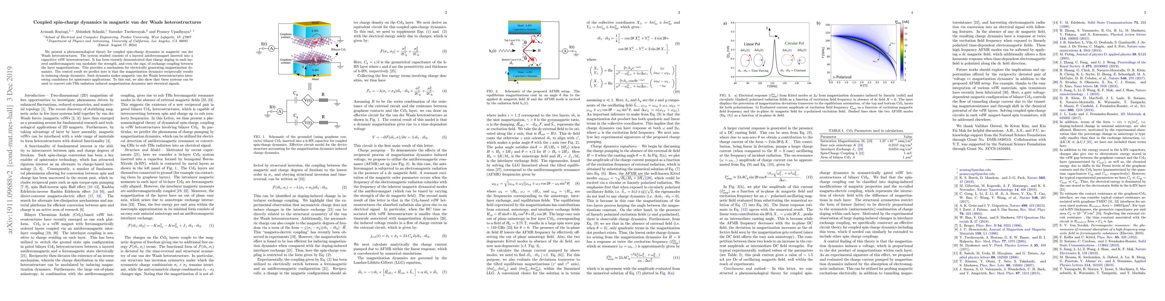We present a phenomenological theory for coupled spin-charge dynamics in magnetic van der Waals heterostructures. The system studied consists of a layered antiferromagnet inserted into a capacitive vdW heterostructure. It has been recently demonstrated that charge doping in such layered antiferromagnets can modulate the strength, and even the sign, of exchange coupling between the layer magnetizations. This provides a mechanism for electrically generating magnetization dynamics. The central result we predict here is that the magnetization dynamics reciprocally results in inducing charge dynamics. Such dynamics makes magnetic van der Waals heterostructures interesting candidates for spintronics applications. To this end, we also show that these systems can be used to convert sub-THz radiation induced magnetization dynamics into electrical signals.