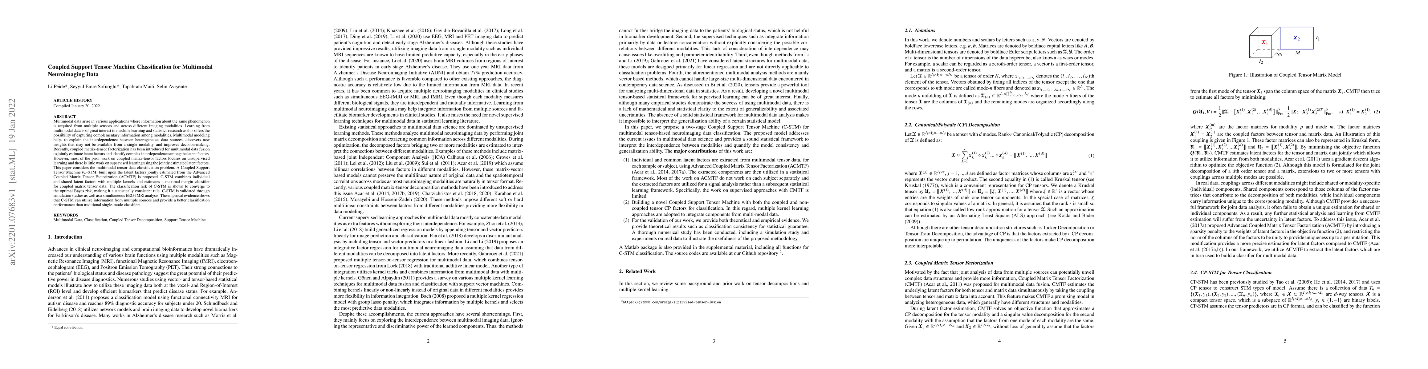 This paper proposes a Coupled Support Tensor Machine (C-STM) for classifying multimodal neuroimaging data by leveraging jointly estimated latent factors from Advanced Coupled Matrix Tensor Factorization (ACMTF). C-STM integrates individual and shared latent factors with multiple kernels to achieve better classification performance compared to single-mode classifiers, validated through simulation studies and EEG-fMRI analysis.