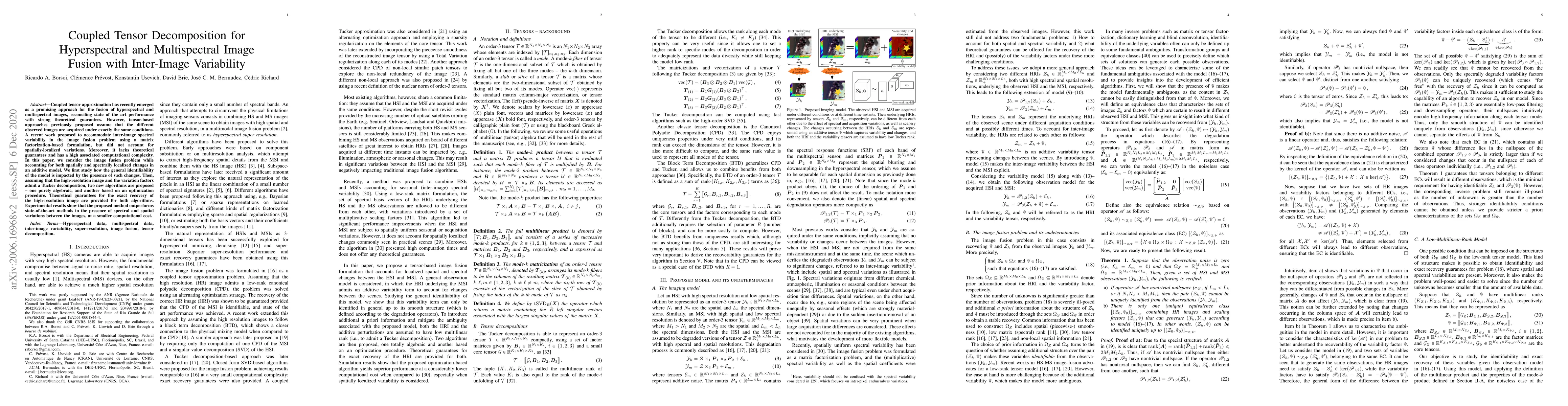 This paper introduces coupled tensor decomposition methods for fusing hyperspectral and multispectral images, addressing inter-image variability both spatially and spectrally. It proposes two new algorithms—an algebraic and an optimization-based approach—with theoretical guarantees for high-resolution image recovery, outperforming existing methods in handling variations while reducing computational complexity.