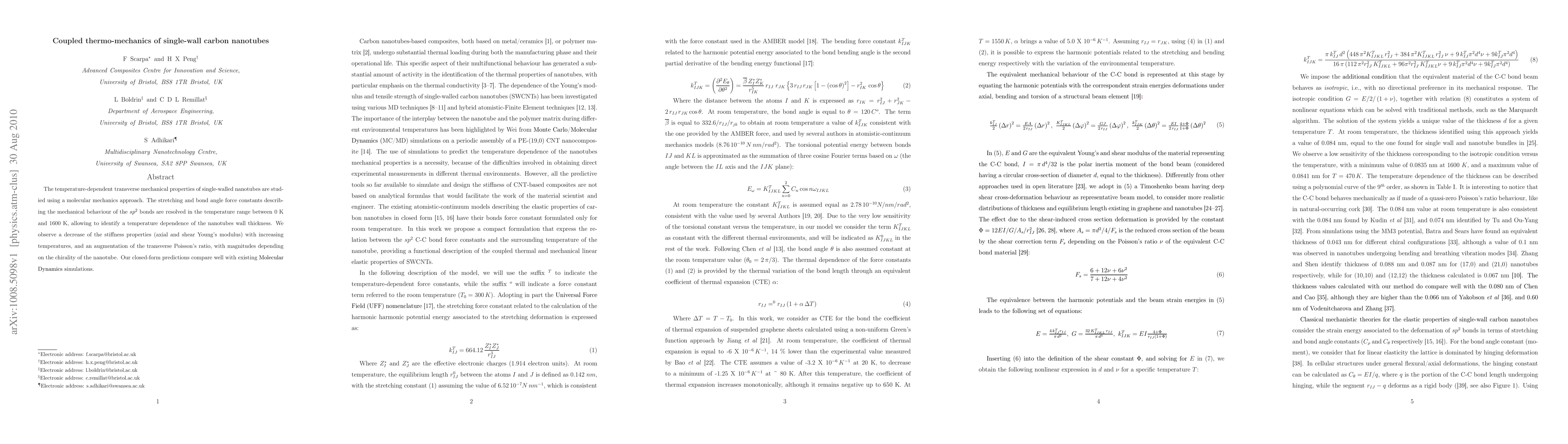 The temperature-dependent transverse mechanical properties of single-walled nanotubes are studied using a molecular mechanics approach. The stretching and bond angle force constants describing the mechanical behaviour of the sp^{2} bonds are resolved in the temperature range between 0 K and 1600 K, allowing to identify a temperature dependence of the nanotubes wall thickness. We observe a decrease of the stiffness properties (axial and shear Young's modulus) with increasing temperatures, and an augmentation of the transverse Poisson's ratio, with magnitudes depending on the chirality of the nanotube. Our closed-form predictions compare well with existing Molecular Dynamics simulations.